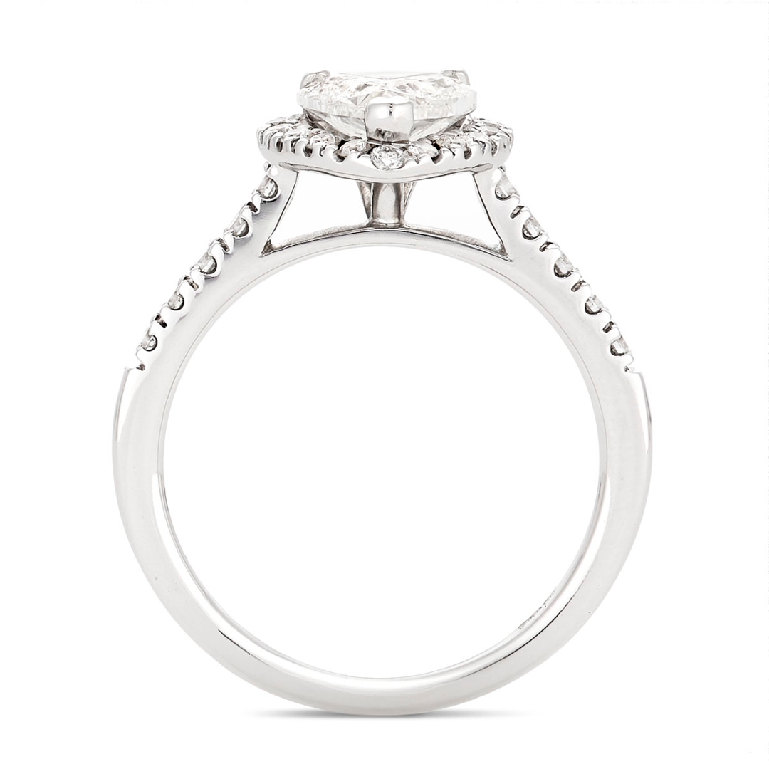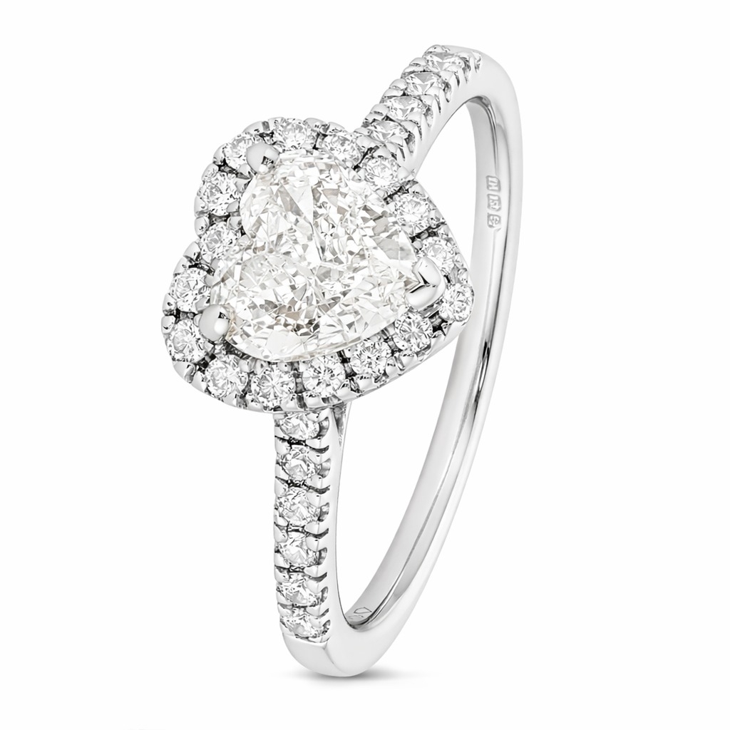 A brand new, unused, certified natural diamond solitaire engagement ring, set with a heart cut diamond to the centre & brilliant cut diamonds in a halo setting & to the shoulders, set in 18ct white gold.