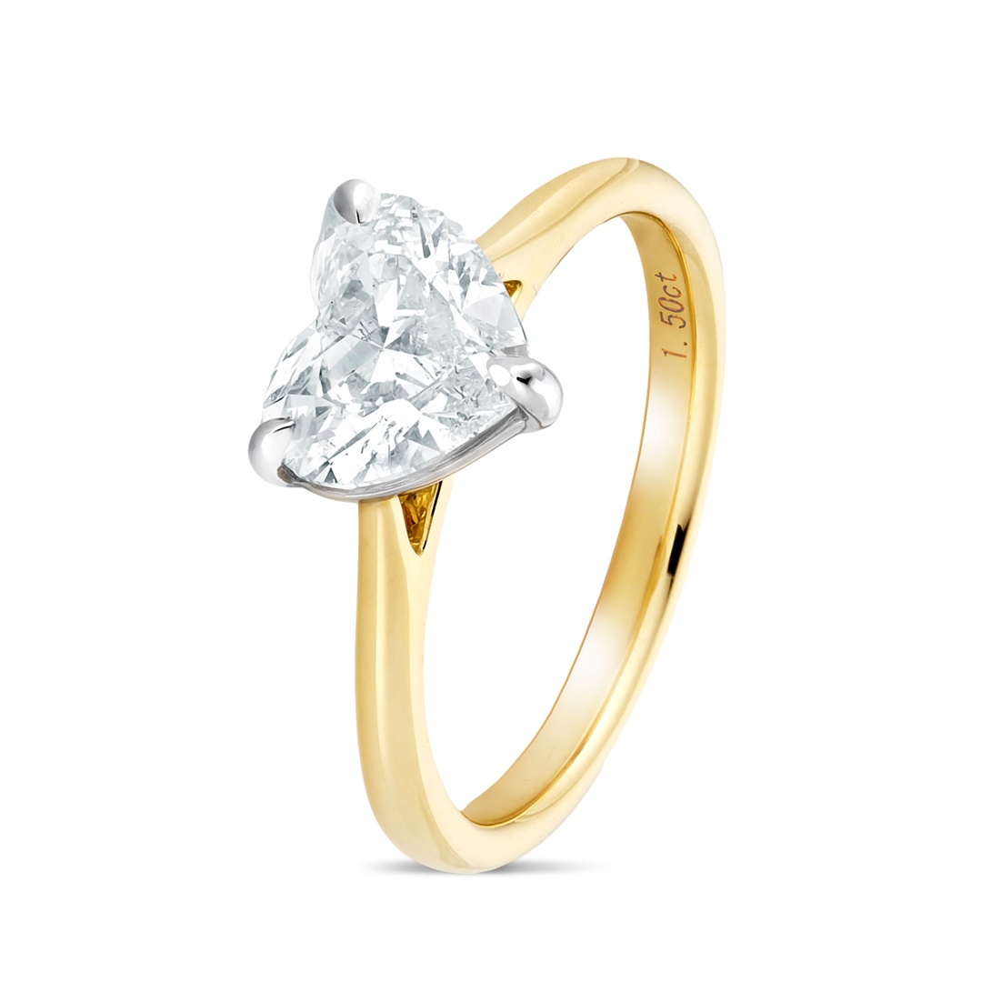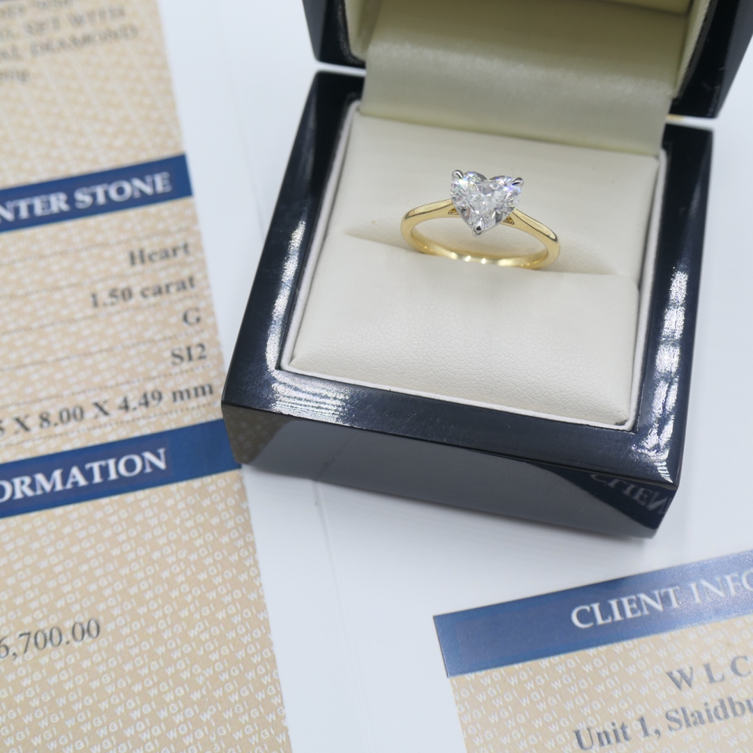 A brand-new, unused certified natural diamond solitaire engagement ring that beautifully combines romance, elegance and exceptional craftsmanship. At its heart lies a stunning 1.50ct heart-cut natural diamond, graded G in colour and SI2 in clarity, radiating warmth and brilliance from every facet. The diamond’s distinctive heart shape symbolises everlasting love, making it a perfect choice for a truly meaningful engagement ring. Expertly set in a refined blend of platinum and 18ct yellow gold, the contrasting metals highlight both the diamond’s luminosity and the timeless charm of its design. With a total weight of 3.50 grams and a professional valuation of £16,700, this piece represents luxury, sophistication and enduring beauty.
