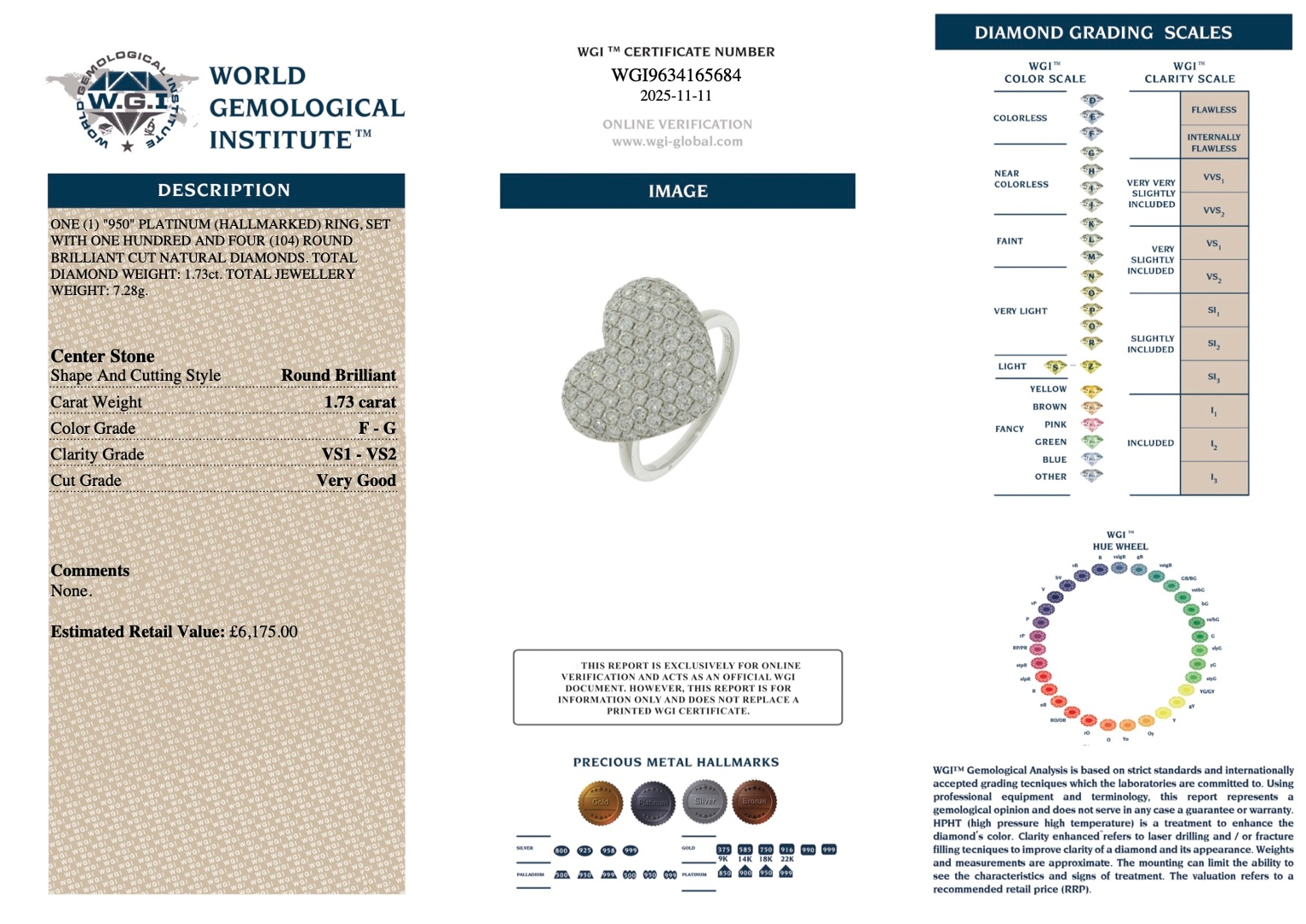 A brand-new, unused, certified natural diamond heart-shaped cluster ring that combines romantic design with refined sparkle and enduring desirability. Set with a 1.73ct cluster of brilliant-cut natural diamonds in F–G colour and VS1–VS2 clarity, the ring presents a bright, lively display of light as each diamond contributes its own crisp flash of brilliance. The heart-shaped arrangement creates a soft, elegant silhouette that feels both meaningful and timeless, giving the piece a distinctive charm that shines when worn. These natural diamonds carry a strong appreciation factor, as collectors continue to value the authenticity and rarity of earth-formed stones, whose enduring beauty and emotional significance remain unmatched. With the global supply of natural diamonds steadily tightening and demand remaining consistently strong, jewellery featuring certified natural stones continues to be viewed as a reassuring long-term investment, offering both visual appeal and dependable future value.