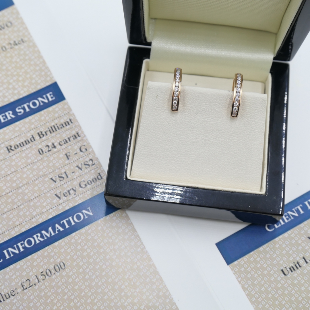 A brand-new, unused certified pair of natural diamond hoop earrings that beautifully blend timeless sophistication with contemporary charm. Each earring is set with a series of brilliant-cut natural diamonds totalling 0.24ct, arranged to create a continuous sparkle that catches the light with every movement. The diamonds are graded F–G in colour and VS1–VS2 in clarity, offering exceptional brilliance and purity. Crafted in luxurious 18ct rose gold, the warm, romantic tone of the metal enhances the diamonds’ radiant sparkle, creating an elegant, versatile design suitable for any occasion. With a total weight of 2.32 grams and a professional valuation of £2,150, these earrings represent both refined craftsmanship and enduring style.