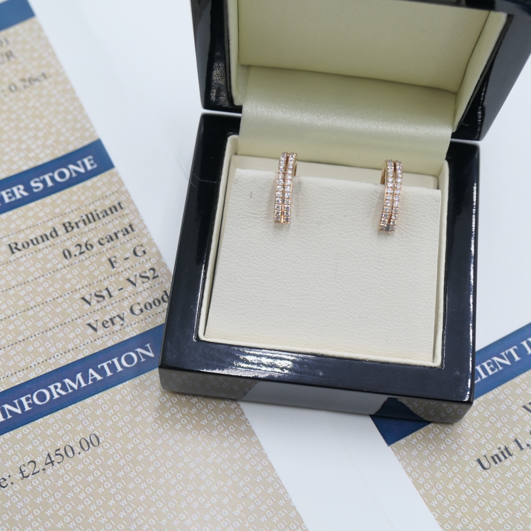 A brand-new, unused, certified pair of 18ct rose gold hoop earrings with natural diamonds offers elegance and sophistication. Set with brilliant cut diamonds, these earrings capture the unique allure of natural diamonds, which have been cherished for centuries for their brilliance, rarity, and enduring beauty. With a total diamond weight of 0.26ct, each stone is graded VS1-VS2 for clarity and F-G for colour, ensuring a dazzling sparkle that catches the light from every angle. The warm, romantic glow of rose gold enhances the natural radiance of the diamonds, creating a refined and luxurious aesthetic.