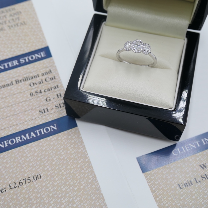 A brand-new, unused, certified natural diamond oval-shaped trio cluster ring, exquisitely crafted in platinum. The design features three stunning oval-cut diamonds at the centre, radiating with natural brilliance and balance. Surrounding these are clusters of brilliant-cut diamonds in an elegant halo setting, enhancing the sparkle and adding depth to the overall composition. With a total diamond weight of 0.54ct, graded G–H in colour and SI1–SI2 in clarity, this ring showcases a beautiful harmony between precision craftsmanship and timeless design.