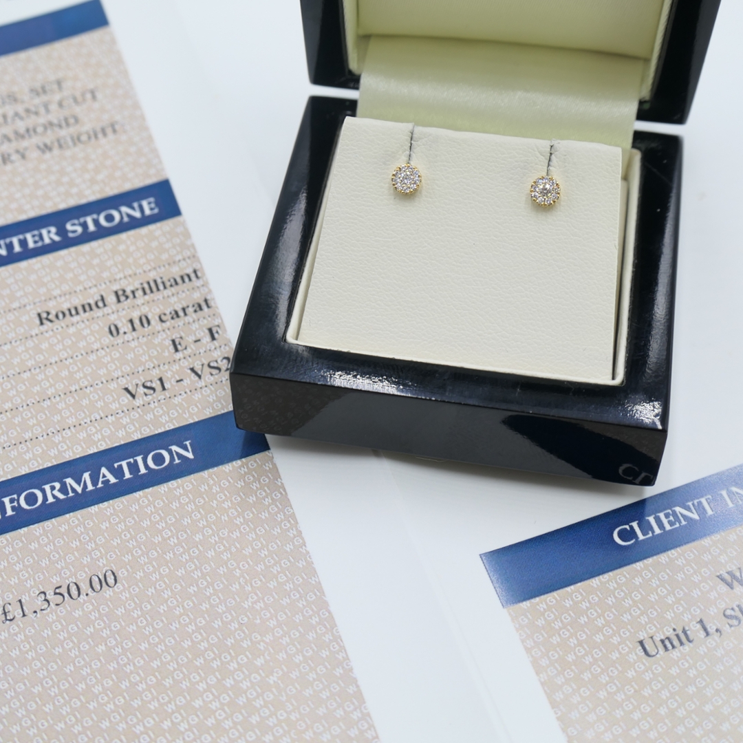 A brand-new, unused, certified pair of 18ct yellow gold natural diamond round-shaped cluster earrings. These elegant pieces are a refined blend of classic design and radiant sparkle. Each earring features a carefully arranged cluster of brilliant-cut natural diamonds, totalling 0.10ct. Graded VS1 to VS2 in clarity and E to F in colour, the diamonds offer exceptional brilliance and near-flawless quality, catching the light with crisp, clear fire.
