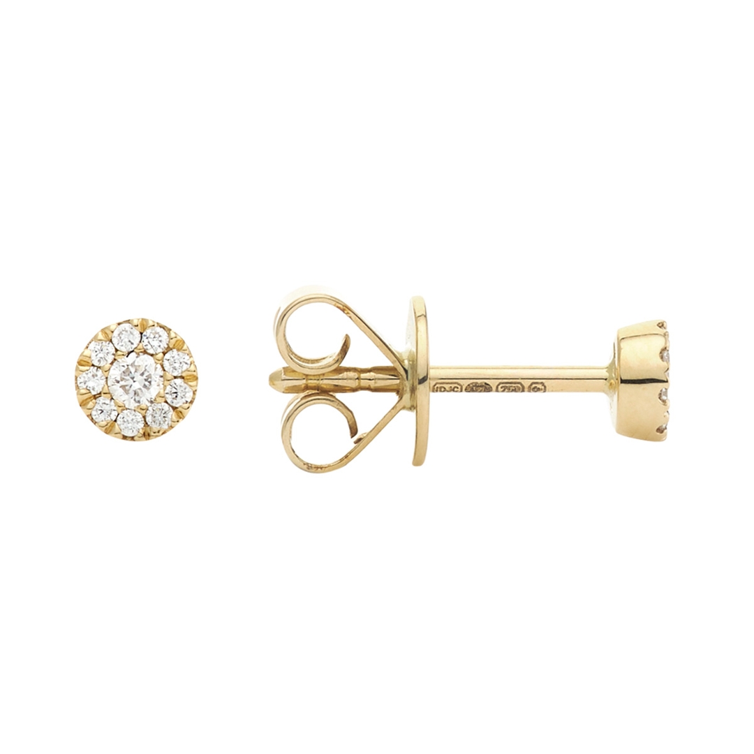 Crafted in rich 18ct yellow gold, the warm glow of the setting provides a beautiful contrast to the icy sparkle of the diamonds, enhancing their natural luminosity. The round cluster design delivers a timeless silhouette with a subtle touch of elegance, perfect for everyday wear or for elevating more formal looks with subtle sophistication.