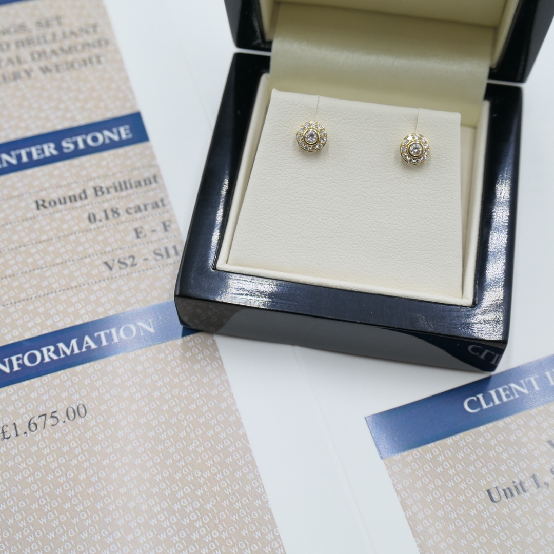 A brand-new, unused, certified pair of 18ct yellow gold natural diamond round-shaped cluster earrings. These exquisite pieces capture the perfect balance of vintage charm and modern elegance. Each earring features a central cluster of brilliant-cut natural diamonds, encircled by a dazzling halo, creating a radiant and dimensional design. With a total diamond weight of 0.18ct, and graded VS2 to SI1 in clarity and E to F in colour, the diamonds display exceptional fire, clarity, and brilliance.