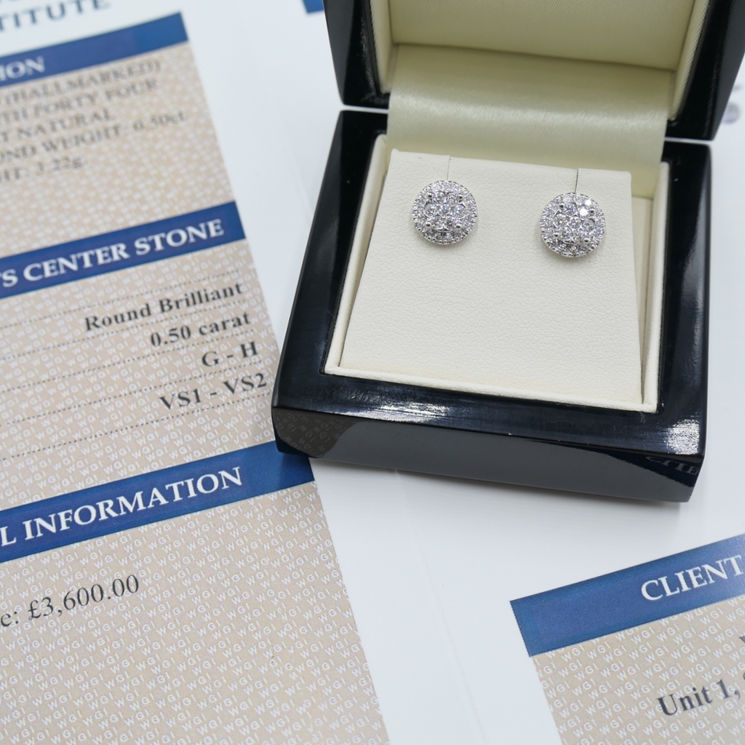 A brand-new, unused, certified pair of 18ct white gold natural diamond round-shaped cluster earrings, these stunning pieces radiate timeless elegance and brilliant craftsmanship. Each earring features a beautifully arranged cluster of brilliant-cut natural diamonds, totalling a generous 0.50ct across the pair. Graded VS1 to VS2 in clarity and G to H in colour, the diamonds display exceptional fire, clarity, and brightness, creating a captivating sparkle that stands out in any setting.