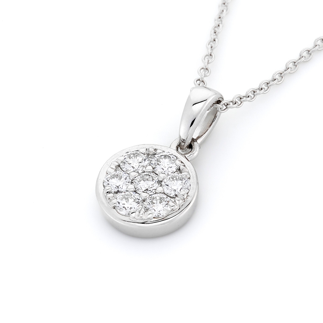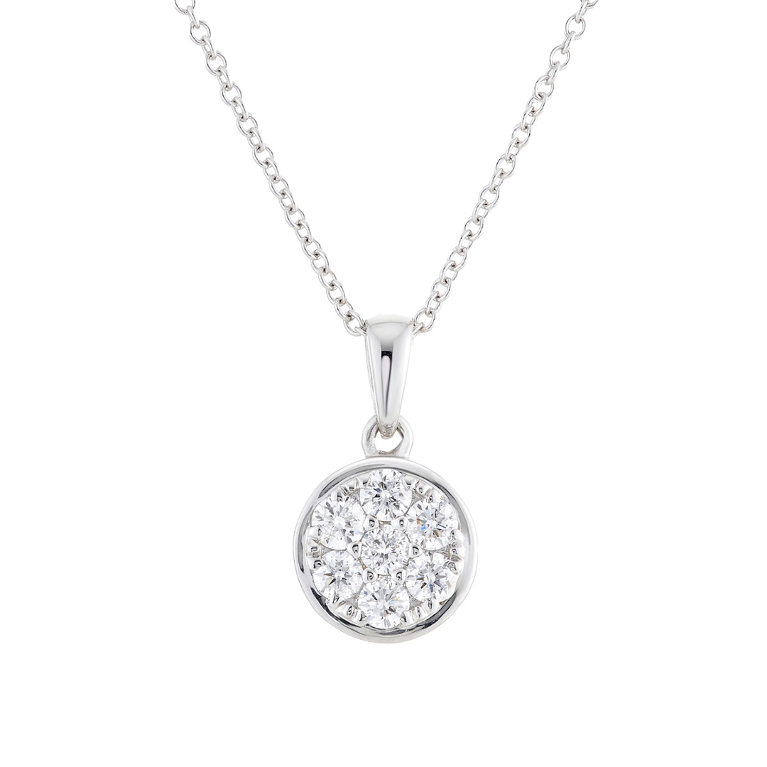 A brand new, unused, certified natural diamond round-shaped cluster pendant, with a cluster of brilliant cut diamonds, set in 18ct white gold.