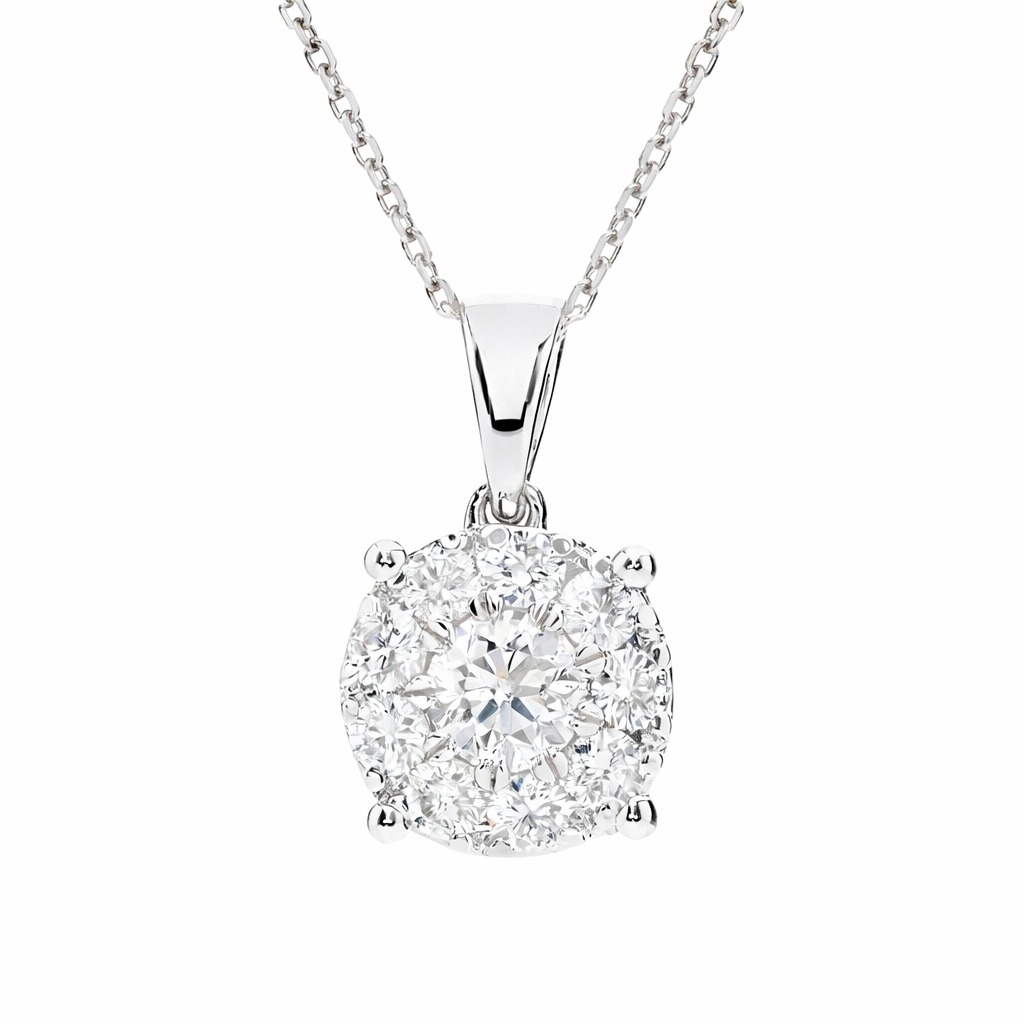 A brand-new, unused, certified natural diamond round-shaped cluster pendant, set with a cluster of brilliant-cut diamonds, set in 9ct white gold.