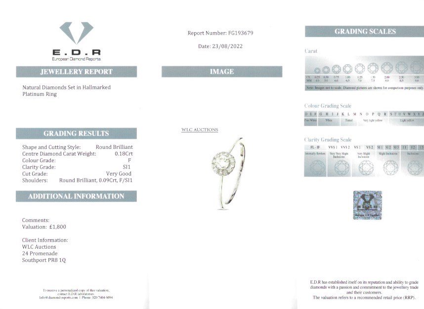 A brand new, unused, certified platinum round-shaped cluster ring. Each diamond, meticulously selected for its exceptional quality, embodies the pure essence of elegance and sophistication. The brilliant-cut centre diamond, weighing 0.18 carats, captures the essence of everlasting love, while the surrounding halo of diamonds enhances its brilliance, symbolising eternal devotion and unity.