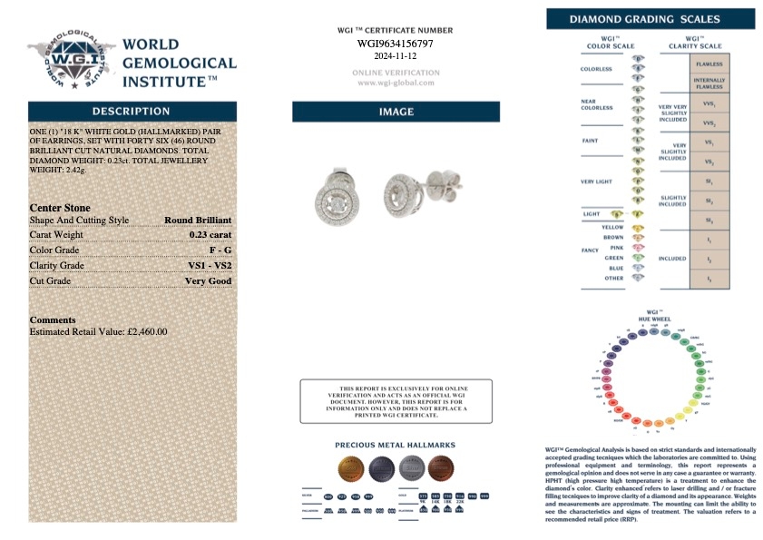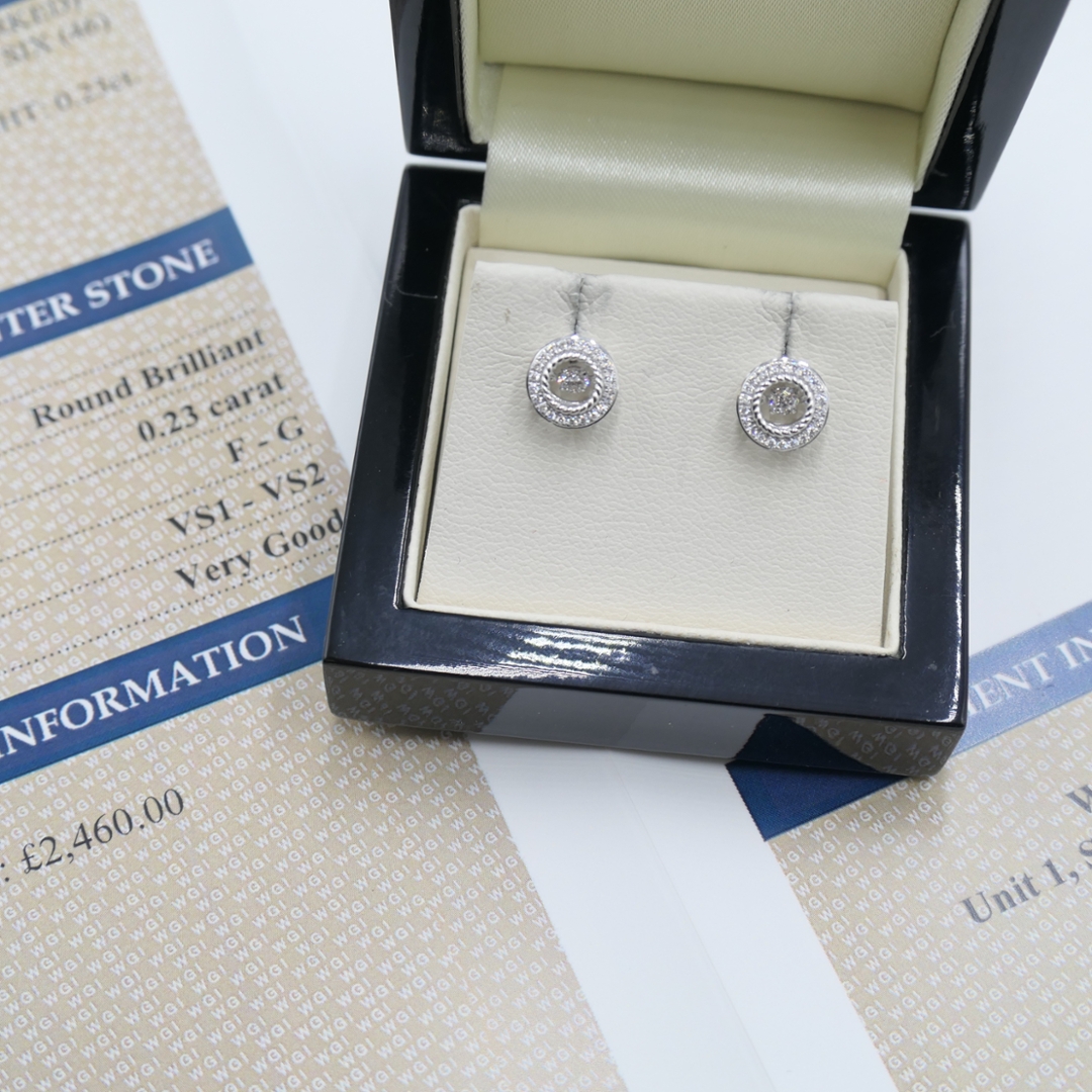 A brand new, unused, certified pair of natural diamond round-shaped earrings, set with brilliant cut diamonds, set in 18ct white gold.