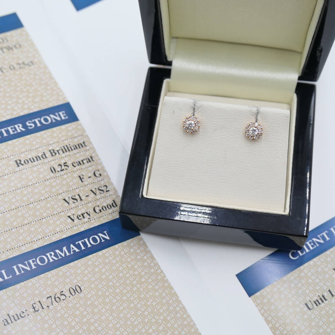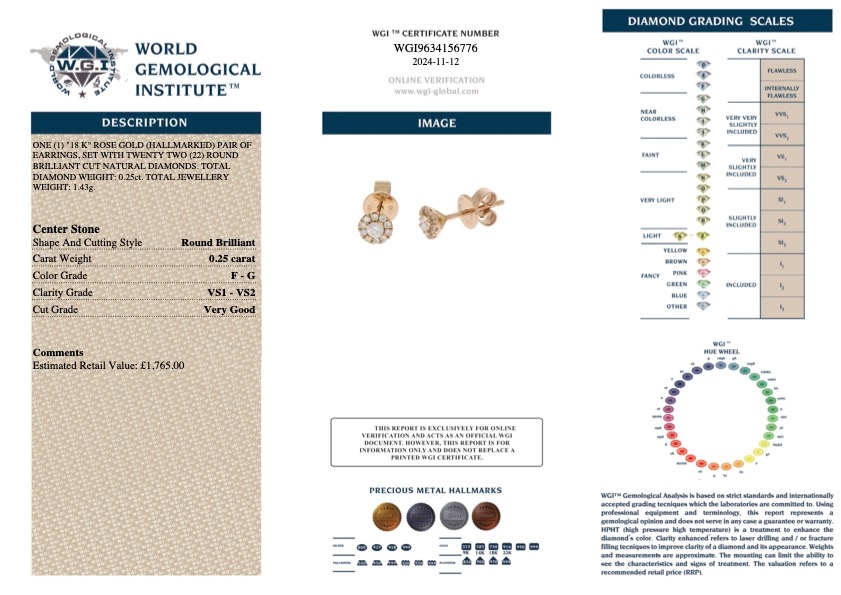 A brand-new, unused, certified pair of 18ct rose gold, natural diamond, round-shaped earrings epitomises elegance and sophistication. Set with a total diamond weight of 0.25ct, these earrings feature brilliant-cut diamonds that exude exceptional brilliance and fire. The diamonds, graded VS1-VS2 for clarity and F-G for colour, are a testament to their superior quality, ensuring a timeless sparkle.