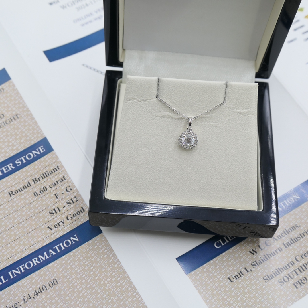 A brand-new, unused, certified natural diamond round-shaped pendant, set with one brilliant-cut diamond to the centre & a cluster of brilliant-cut diamonds in a halo design, set in 18ct white gold.