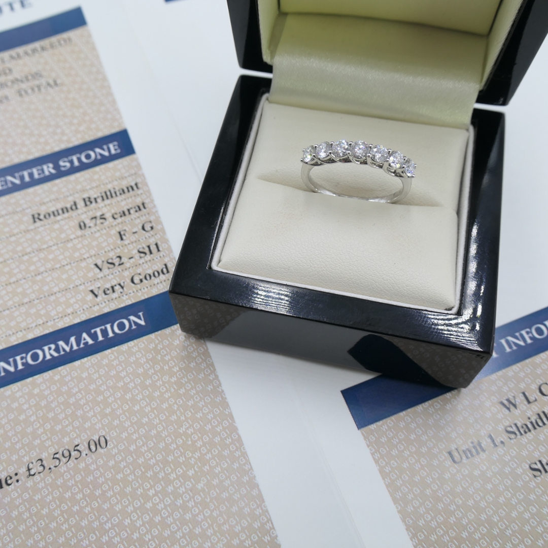 A brand-new, unused, certified 18ct white gold natural diamond eternity ring, set with seven brilliant-cut diamonds. The total diamond weight is 0.75ct, with diamonds graded VS2-SI1 for clarity and F-G for colour, ensuring a stunning display of brilliance and clarity.
