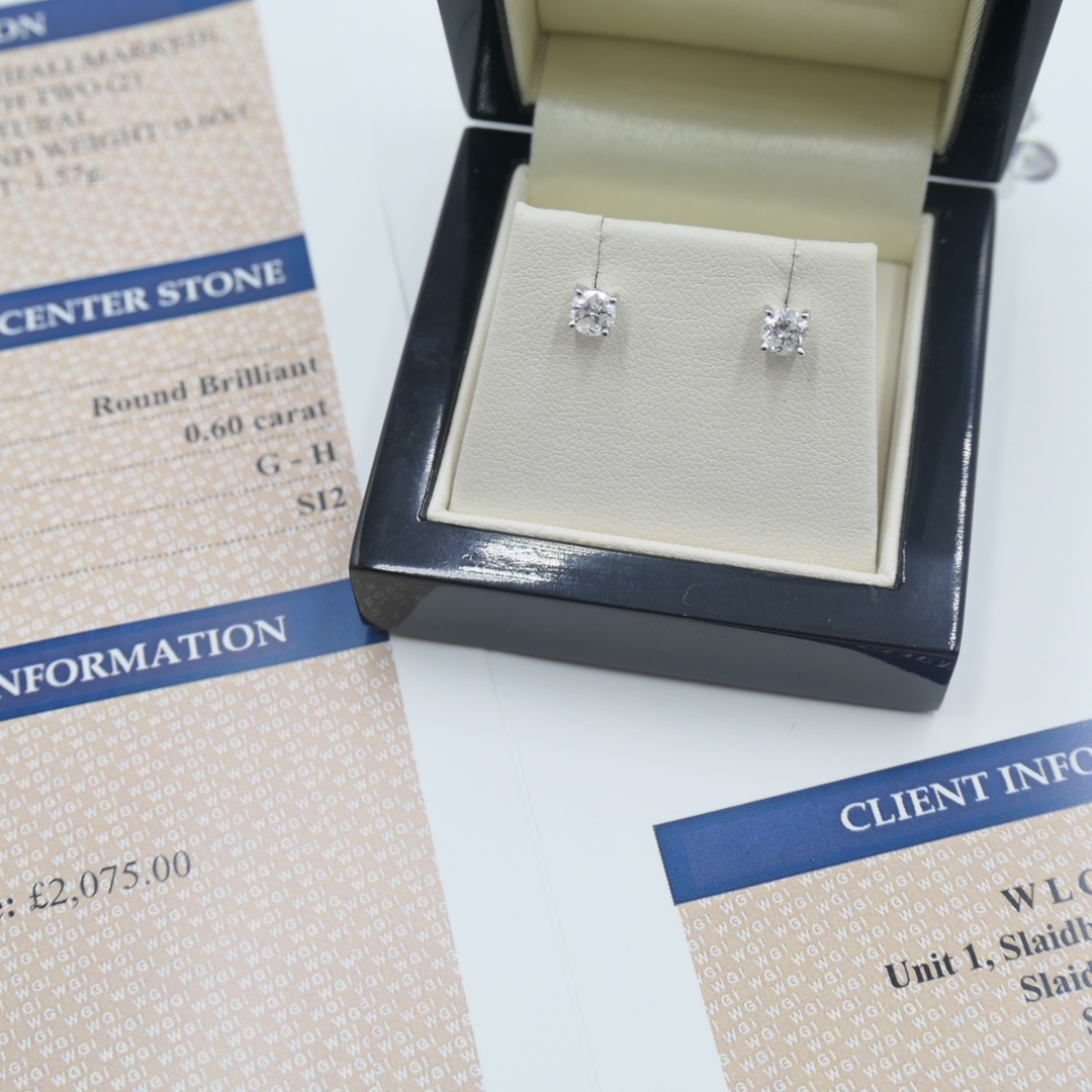 A brand new, unused certified pair of natural diamond solitaire earrings that exude timeless elegance and radiant brilliance. Each earring features a stunning brilliant-cut natural diamond, weighing 0.60ct, offering an exquisite balance of fire, sparkle and clarity. The diamonds are graded G–H in colour and SI2 in clarity, producing a captivating luminosity that reflects light with effortless beauty. Expertly crafted in 18ct white gold, the cool, mirror-like finish enhances the diamonds’ pristine radiance while adding a contemporary touch of luxury. With a total weight of 1.57 grams and a professional valuation of £2,075, these earrings represent superior craftsmanship, refined design and enduring sophistication.