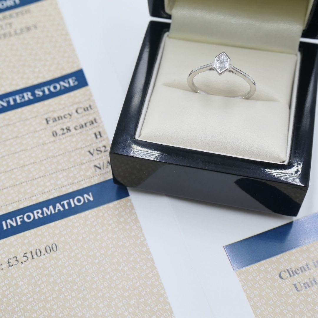 A brand-new, unused, certified platinum natural diamond solitaire ring features a mesmerising fancy-cut diamond at its centre. The diamond, weighing 0.28 carats, captivates with its exceptional clarity graded at VS2 and a radiant colour grade of H, showcasing a harmonious blend of brilliance and warmth.