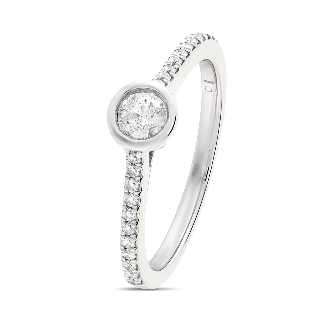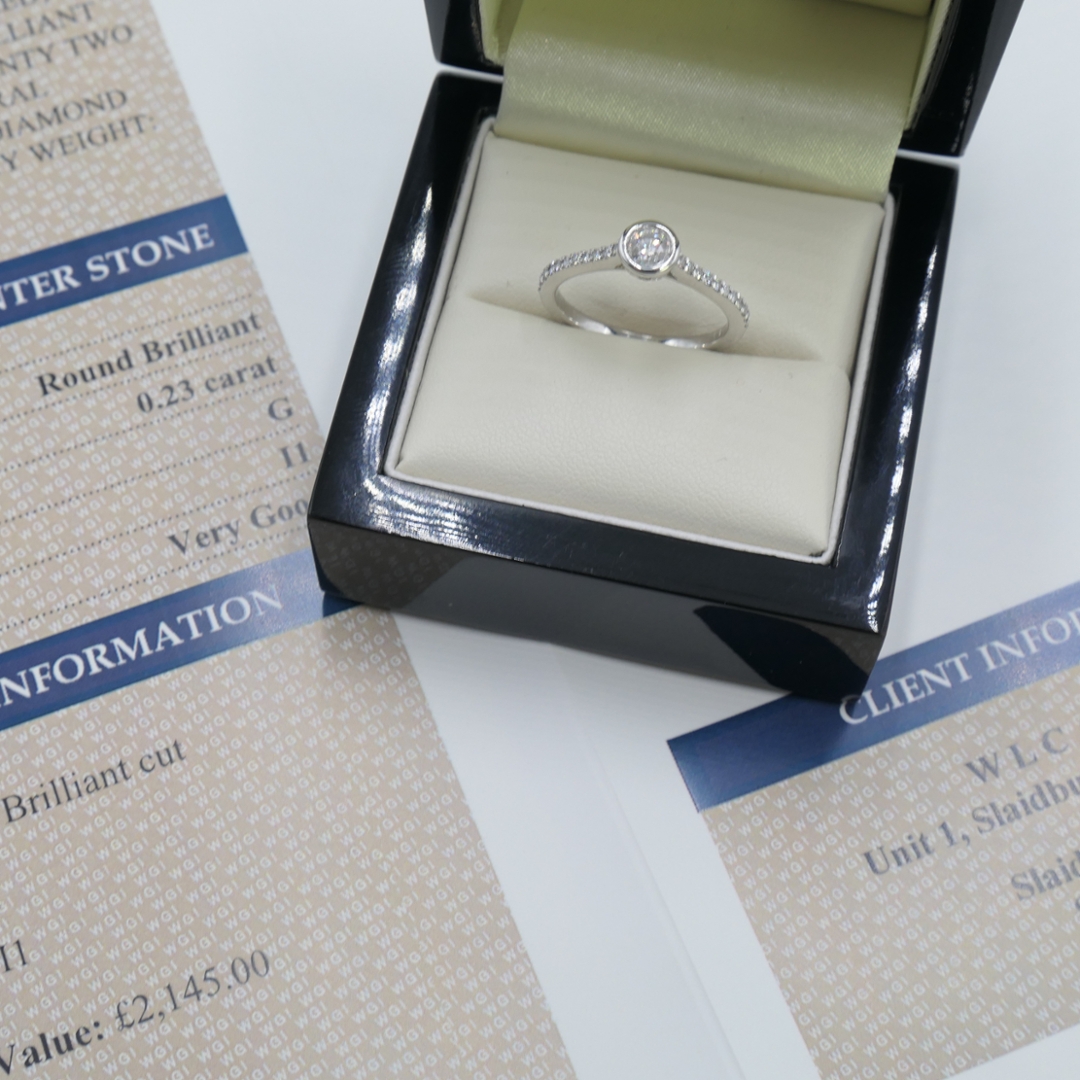 The centre diamond weighs 0.23 ct and is graded I1, with a G colour. While the clarity may not be flawless, the diamond still offers remarkable sparkle and warmth, thanks to its inviting G colour. The diamonds on the shoulders have a total weight of 0.15ct, with SI2-I1 clarity and G-H colour, carefully chosen to complement the centre stone. Despite varying clarity grades, these diamonds reflect light beautifully, enhancing the ring's overall elegance.