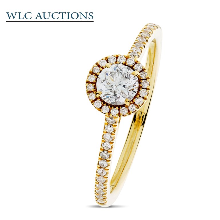 A brand-new, unused, certified natural diamond solitaire engagement ring, set with a brilliant-cut diamond to the centre & a cluster of brilliant-cut diamonds in a halo setting & to the shoulders, set in 18ct yellow gold.