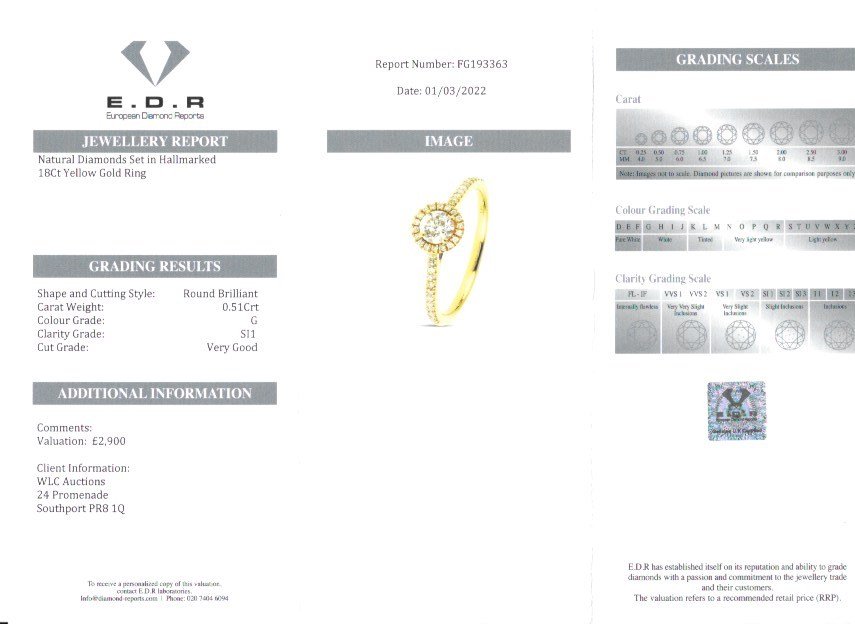 A brand-new, unused, certified 18ct yellow gold natural diamond solitaire ring exudes elegance and sophistication with its captivating design. At the centre of the ring shines a brilliant-cut diamond weighing 0.51 carats, radiating brilliance and beauty. With a clarity grade of SI1 and a colour grade of G, this central diamond boasts exceptional clarity and a dazzling white hue, making it a stunning focal point.