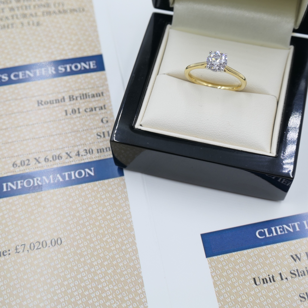 A brand-new, unused certified 18ct yellow and white gold solitaire engagement ring, designed to embody both elegance and distinction. At the centre sits a 1.01ct brilliant-cut natural diamond, carefully selected for its beauty and sparkle. With a G colour grade that ensures a bright white appearance and SI1 clarity that offers a delicate balance of purity and brilliance, this diamond is set to maximise light performance, creating a captivating display of fire and scintillation. The craftsmanship of the setting enhances the diamond’s natural radiance, making this a piece that is both refined and timeless.