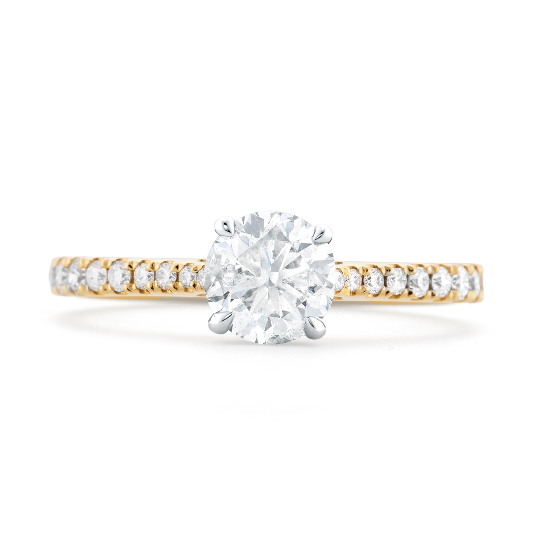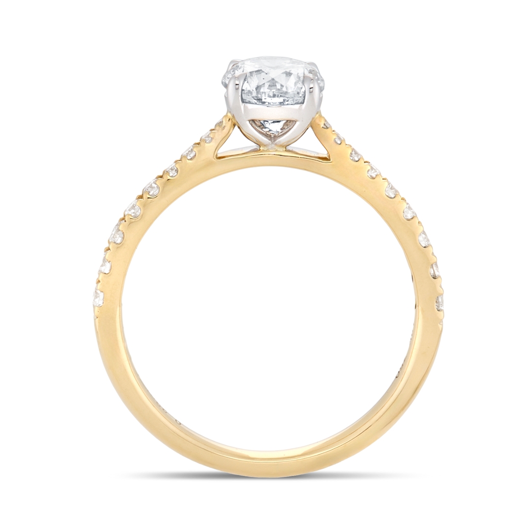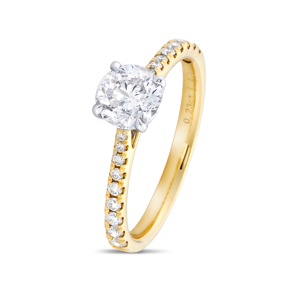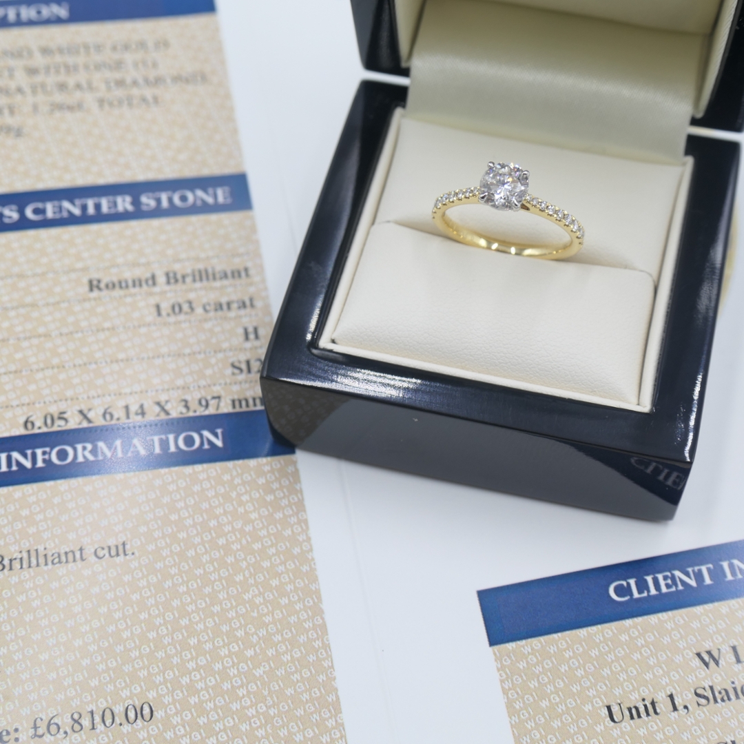 A brand-new, unused certified 18ct yellow and white gold solitaire engagement ring, created with elegance and attention to detail to showcase the natural beauty of diamonds. At its centre is a brilliant-cut diamond weighing 1.03 carats, graded SI2 clarity and H colour, delivering a sparkle that is both lively and refined. Enhancing the design, the shoulders are adorned with a cluster of brilliant-cut diamonds totalling 0.23 carats, graded between VS2 and SI1 clarity and G–H colour, adding extra radiance and completing the piece with a harmonious finish. The blend of white gold and yellow gold creates a striking, timeless contrast, ensuring the ring remains a classic.