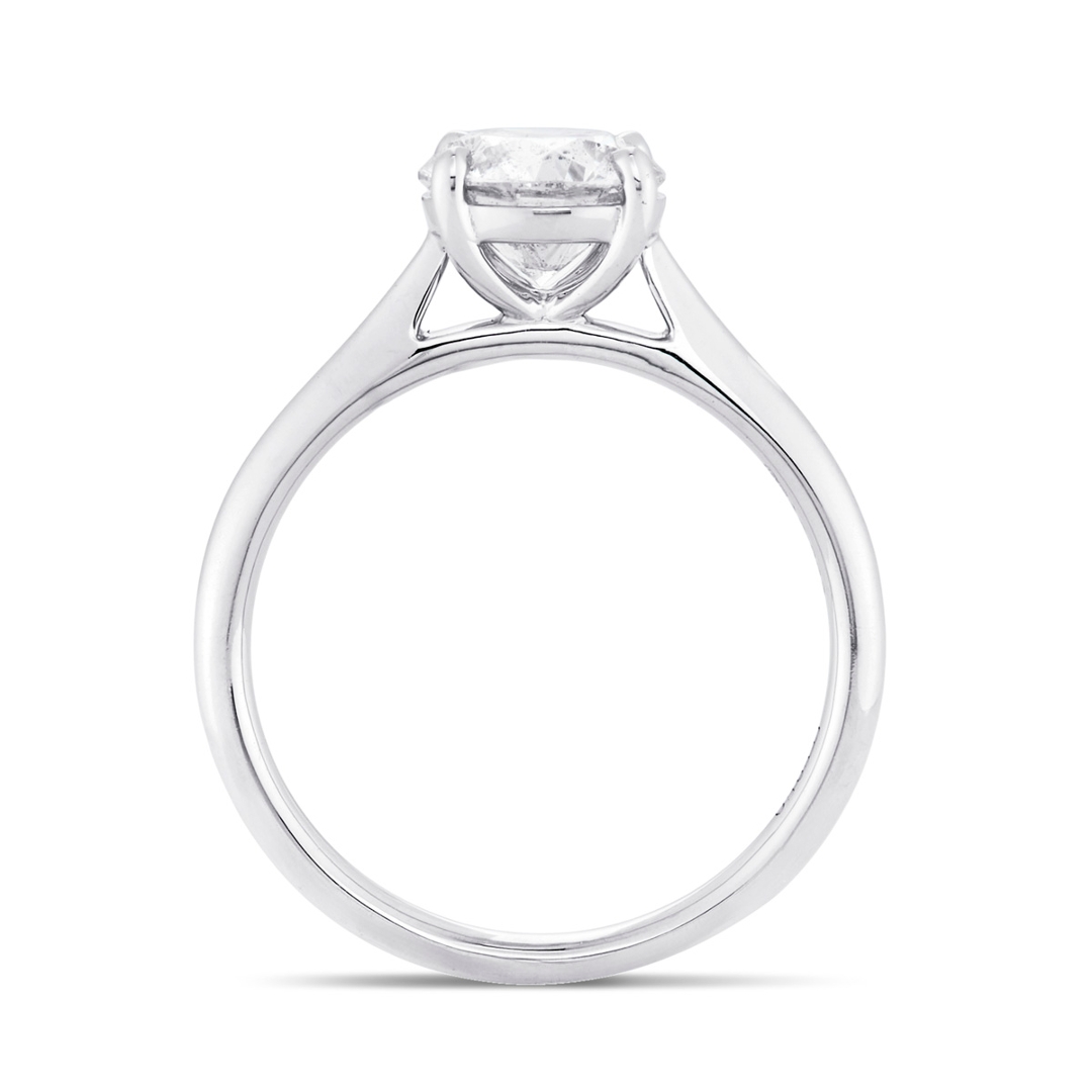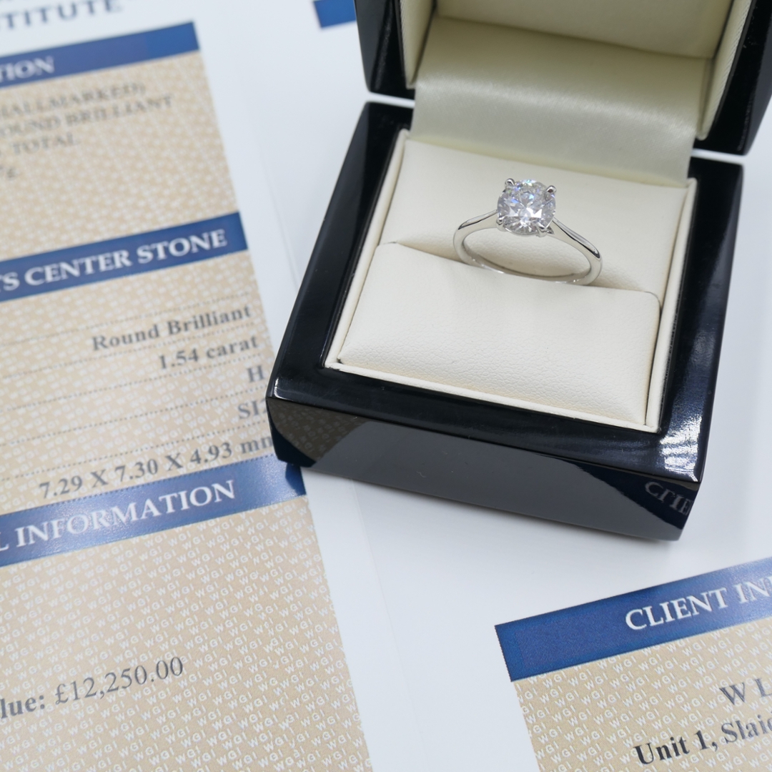 A brand-new, unused, certified platinum natural diamond solitaire engagement ring that captures elegance, romance, and enduring value. At its centre rests a 1.54-carat brilliant-cut diamond, admired for its size and radiant sparkle. With a clarity grade of SI2 and a colour grade of H, the stone offers a lively play of light with a touch of warmth, creating a striking brilliance that will be cherished for a lifetime. As a natural diamond, it carries rarity and authenticity that heighten both its meaning and desirability.