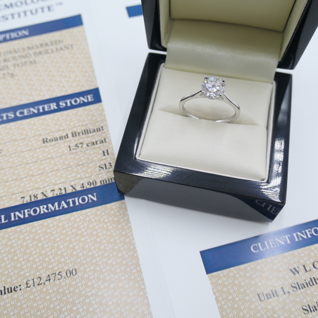A brand-new, unused certified platinum solitaire engagement ring, designed to showcase the brilliance and rarity of a natural diamond. At its centre rests a 1.57-carat brilliant-cut diamond, graded SI3 clarity and H colour, offering a lively sparkle with a delicate balance of size and presence. The platinum mount provides both durability and refinement, enhancing the stone's brightness while ensuring the design remains timeless and elegant with a weight of 4.27 grams. This classic arrangement showcases the natural charm of the diamond, making it the piece's centrepiece.