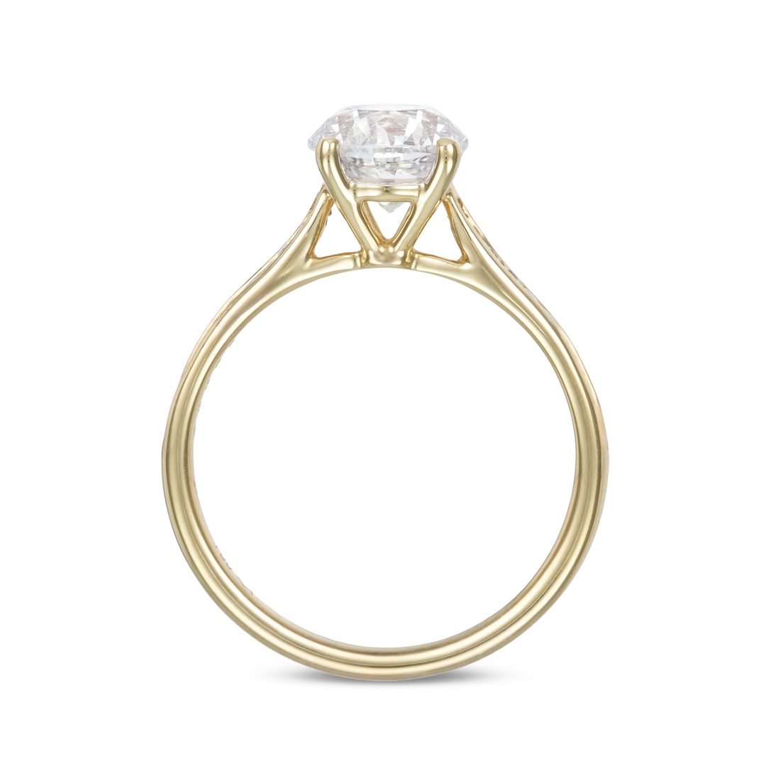 The warm tone of the 18ct yellow gold setting offers a timeless contrast against the crisp brilliance of the diamonds, creating a classic yet eye-catching aesthetic. Weighing 2.77g, the ring is both lightweight and elegant, designed for comfortable daily wear while maintaining a luxurious presence. Its enduring design ensures it remains a highly desirable style within the engagement ring market.