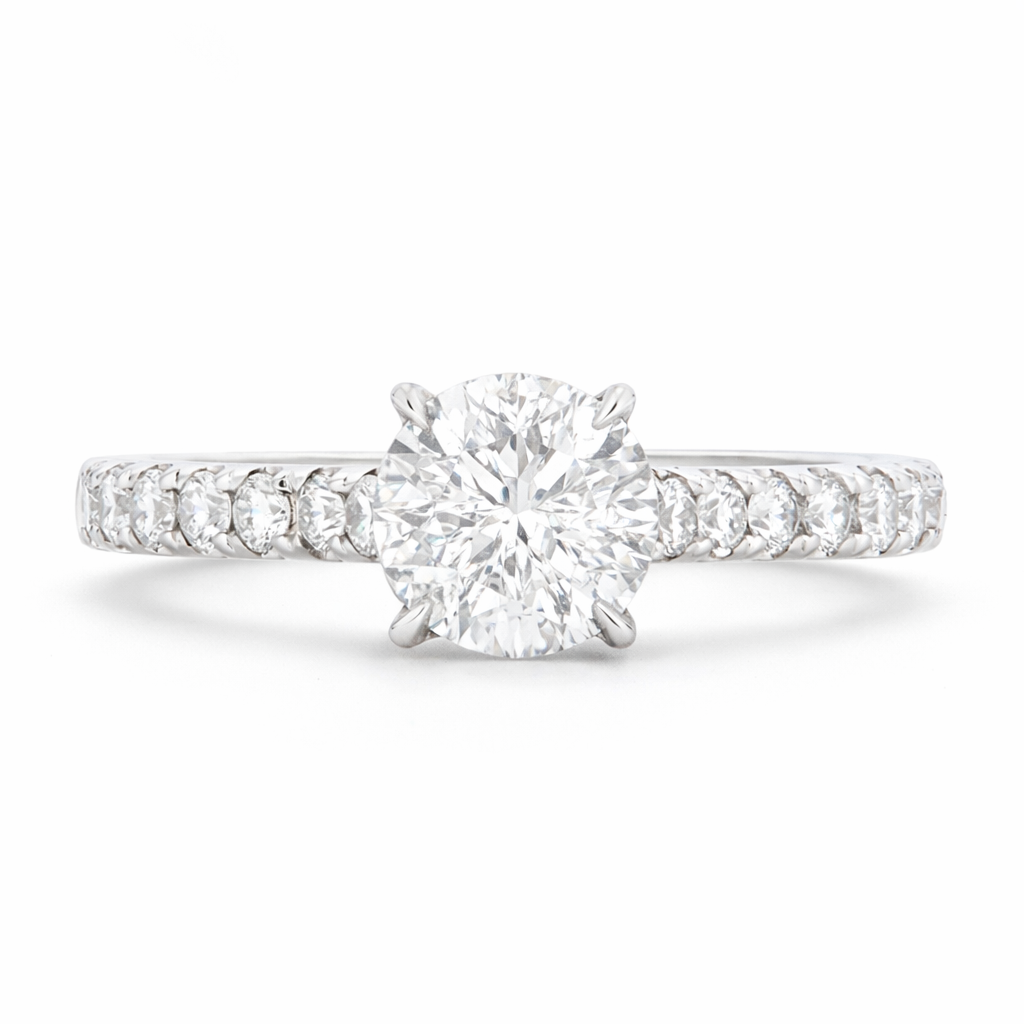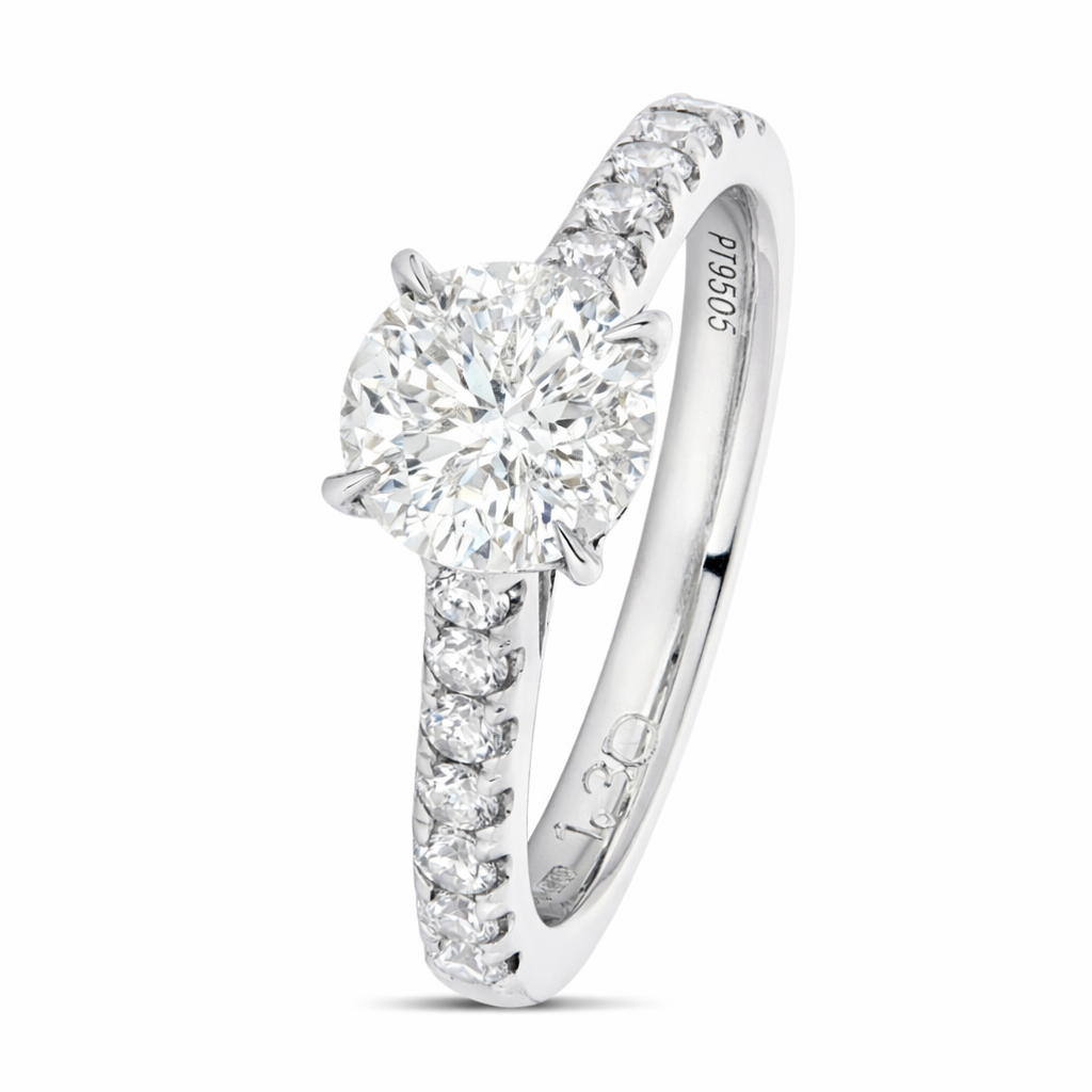 A brand-new, unused, certified natural diamond solitaire engagement ring, this exquisite piece embodies timeless beauty and refined craftsmanship. At its centre lies a stunning 1.30-carat brilliant-cut natural diamond, graded F in colour and I1 in clarity, radiating a captivating sparkle that catches the light effortlessly. The centre stone is complemented by a graceful arrangement of brilliant-cut diamonds along the shoulders, totalling 0.41 carats, graded F–G in colour and VS–SI in clarity. Together, they create a breathtaking display of brilliance and fire, showcasing the purity and allure that make natural diamonds so deeply admired.