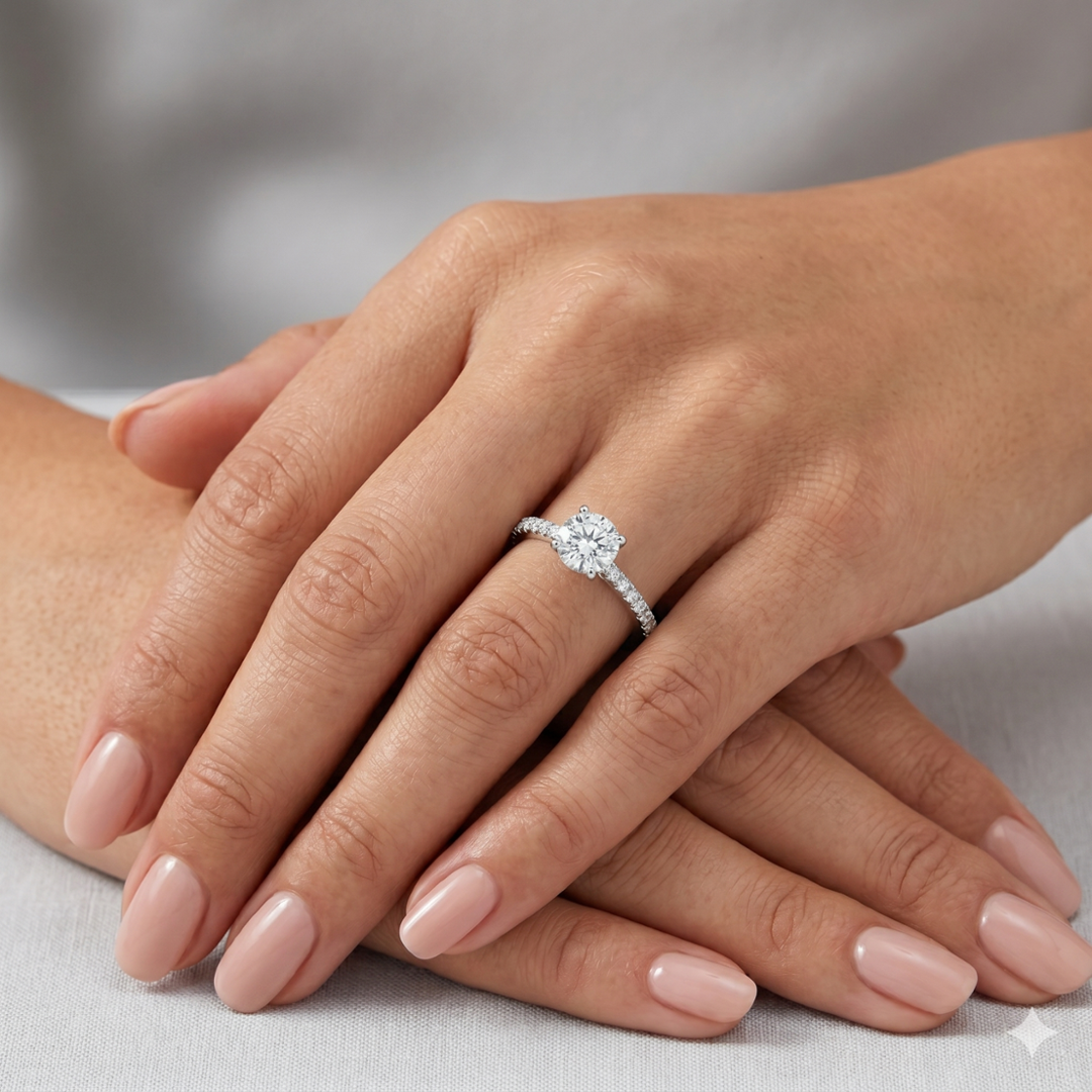 The shoulders are set with a cluster of brilliant-cut diamonds totalling 0.24ct, with SI1 clarity and G–H colour grades. These accent stones add sparkle and dimension, enhancing the ring's overall radiance while maintaining a refined, well-proportioned design that draws attention naturally to the centrepiece.