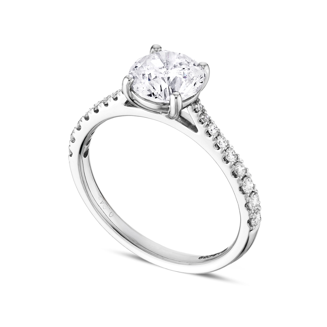 A brand-new, unused, certified natural diamond solitaire engagement ring, with one brilliant-cut diamond at the centre & a cluster of brilliant-cut diamonds to the shoulders, set in platinum.