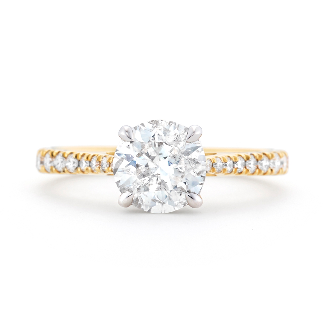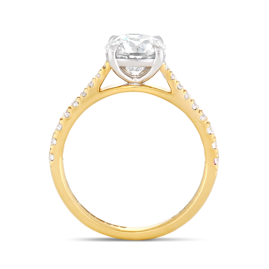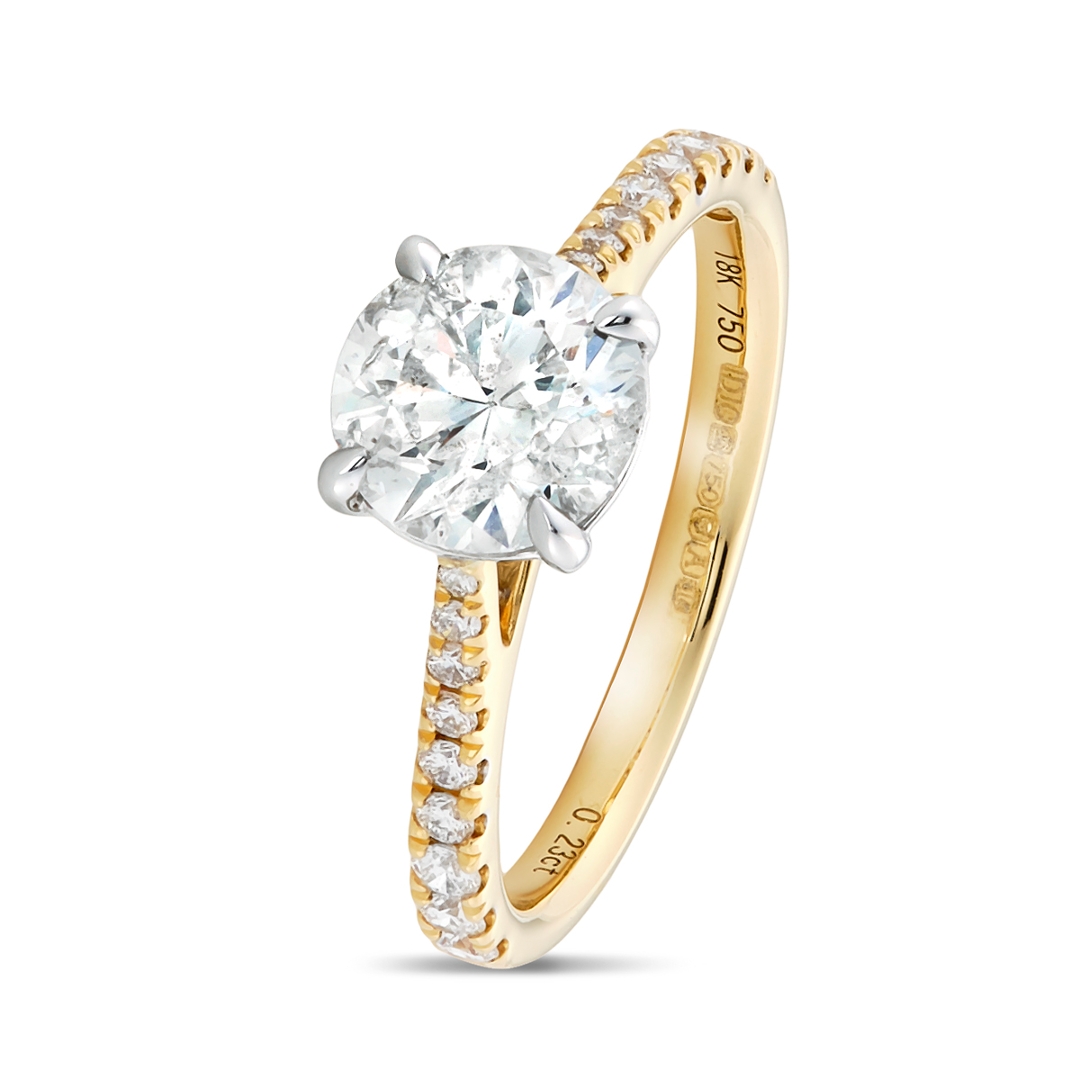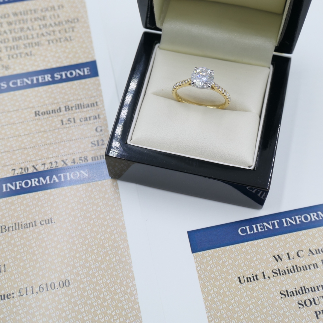 A brand-new, unused certified 18ct yellow and white gold solitaire engagement ring, designed with elegance to showcase the timeless brilliance of natural diamonds. At its heart lies a 1.51-carat round brilliant-cut diamond, graded SI2 clarity and G colour, offering an excellent balance of brightness, fire, and presence. Adding to its charm, the shoulders are adorned with a cluster of additional round brilliant-cut diamonds, totalling 0.31 carats, graded between VS2 and SI1 clarity with a G–H colour. This thoughtful detail enhances the central stone, creating a harmonious sparkle across the ring and elevating its sophistication.