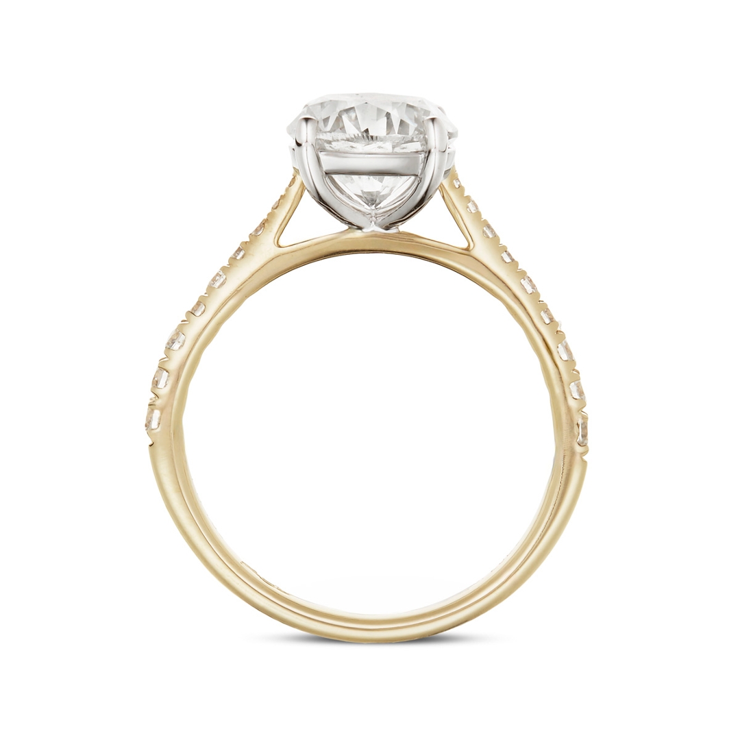 The shoulders are set with a cluster of brilliant-cut diamonds totalling 0.25ct, with SI1 clarity and G–H colour grades. These accent stones provide a refined continuation of sparkle, enhancing the overall light performance while maintaining a balanced and sophisticated profile. The contrast between platinum and yellow gold adds depth and character, appealing to those seeking a classic yet distinctive design.
