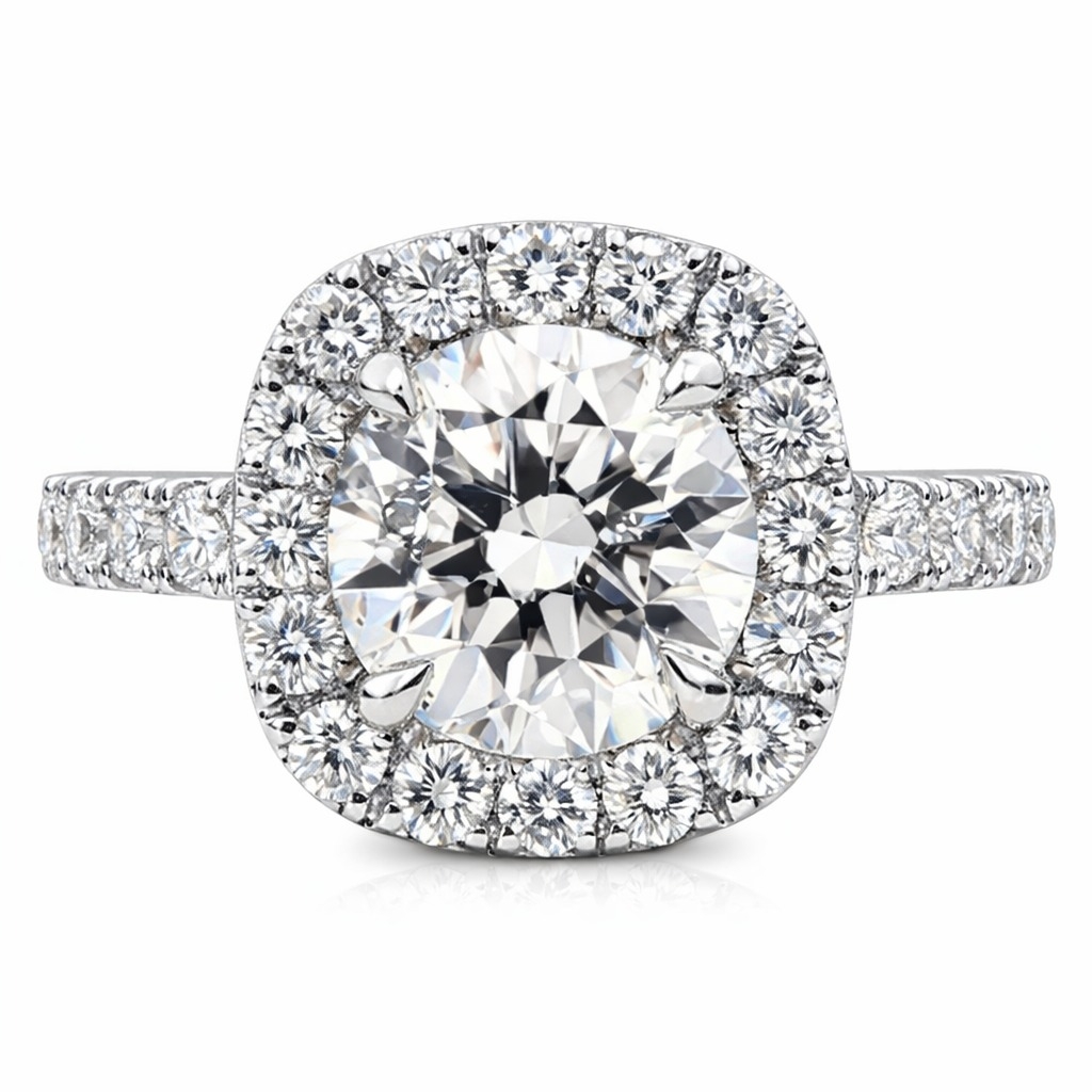 Encircling the centre diamond is a halo of brilliant-cut natural diamonds, extending seamlessly along the shoulders and adding a further 1.03ct in total. These accent stones, graded G–H colour and SI1–SI2 clarity, are carefully matched to enhance the centre stone’s presence, amplifying sparkle and creating exceptional finger coverage. The platinum setting provides a cool-toned backdrop that enhances the diamonds' brightness while offering strength and durability. The total ring weight is 7.56g, giving a reassuring and substantial feel.