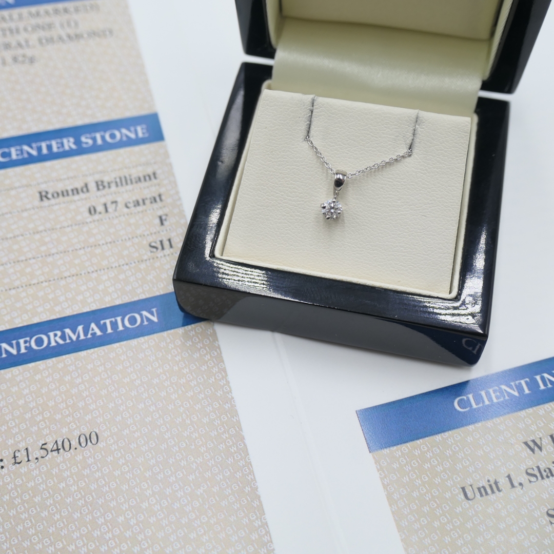 A brand-new, unused certified 18ct white gold natural diamond solitaire pendant, designed to showcase the pure beauty of a single, stunning diamond. Set with one brilliant-cut natural diamond weighing 0.17ct, this pendant showcases the stone’s exceptional clarity (SI1) and brilliant F colour, allowing it to radiate with a dazzling sparkle. The sleek white gold setting offers a clean, sophisticated backdrop that accentuates the diamond’s brilliance, making it the perfect piece for those who appreciate timeless elegance and understated luxury.