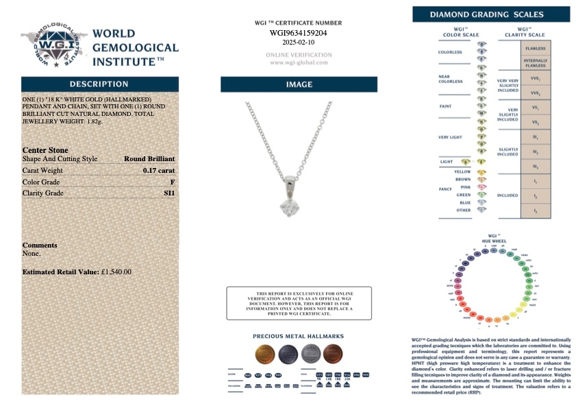 Natural diamonds have long been celebrated for their beauty and rarity, making them treasured for their aesthetic appeal and valued as a solid investment. As the availability of natural diamonds continues to decline, certified pieces like this solitaire pendant become increasingly desirable, offering lasting value alongside their undeniable charm. Weighing 1.82 grams. With a valuation of £1,540.00, this pendant provides an excellent opportunity to own a piece of jewellery that combines immediate visual appeal and future potential. Whether worn every day or reserved for special occasions, this pendant is a lasting symbol of nature’s finest creations, promising to be cherished and admired for generations to come.