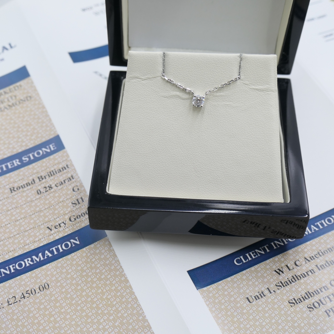 A brand-new, unused certified natural diamond solitaire pendant, embodying timeless elegance and exceptional craftsmanship. This exquisite piece is set with a single brilliant-cut natural diamond weighing 0.28ct, showcasing a captivating sparkle that reflects both purity and refinement. Graded G in colour and SI1 in clarity, the diamond radiates a bright, lively brilliance, perfectly complemented by the cool, lustrous tone of 18ct white gold. The minimalist design draws all attention to the diamond’s natural beauty, creating a pendant that is effortlessly sophisticated and eternally stylish.