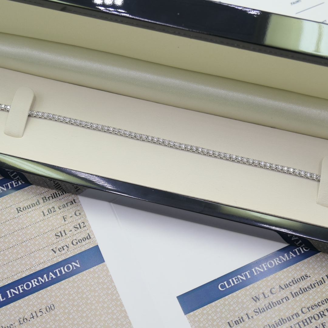 A brand-new, unused 18ct white gold tennis bracelet set with a stunning cluster of natural, certified brilliant-cut diamonds. This bracelet weighs 7.66 grams. This exceptional piece embodies timeless elegance, meticulously crafted to ensure every element radiates sophistication and beauty. The bracelet features a total diamond weight of 1.02ct, with stones of SI1-SI2 clarity and F-G colour, offering a near-flawless sparkle that will captivate for a lifetime.