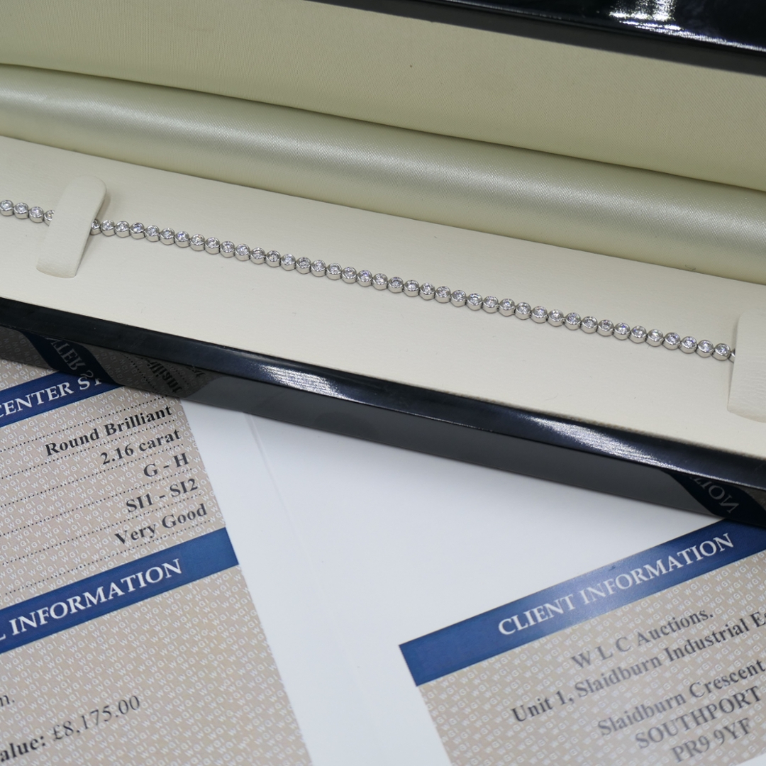 A brand-new, unused certified 18ct white gold natural diamond tennis bracelet, this exquisite piece features a cluster of brilliant-cut diamonds. With a total diamond weight of 2.16ct, the diamonds have SI1-SI2 clarity and G-H colour, ensuring a breathtaking sparkle and brilliance. Each diamond has been expertly selected to create a harmonious, radiant design, making this bracelet a symbol of luxury.