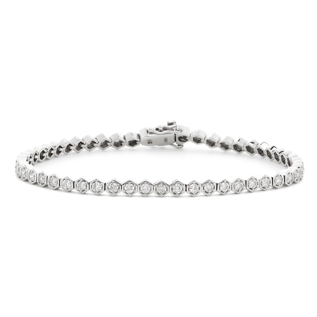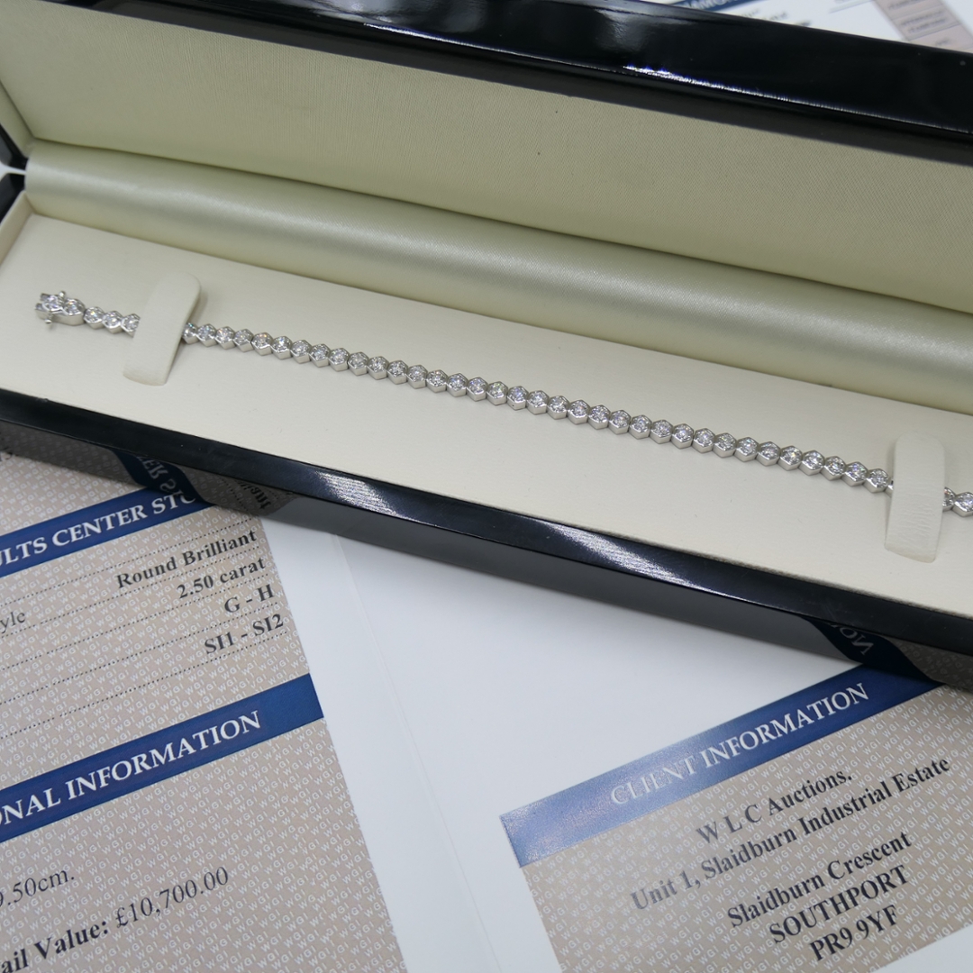 A brand-new, unused certified 18ct white gold natural diamond tennis bracelet, this beautiful piece is set with a stunning collection of brilliant-cut diamonds. With a total diamond weight of 2.50ct, the diamonds are of SI1-SI2 clarity and G-H colour, ensuring they shine with exceptional brilliance and fire. Each diamond has been carefully selected for its excellent quality, resulting in a cohesive and radiant design.