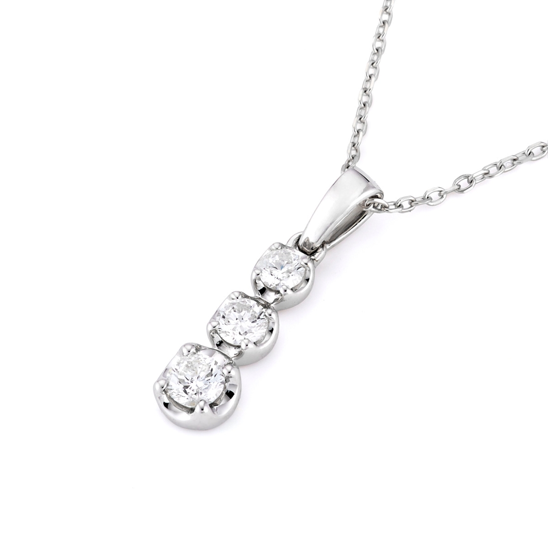 A brand-new, unused certified 18ct white gold natural diamond three-stone droplet pendant, beautifully set with three round brilliant-cut natural diamonds totalling 0.30 carats. Each diamond has been carefully selected for its F–G colour and SI1–SI2 clarity, offering exceptional sparkle and radiance. The vertical design symbolises past, present, and future, creating an elegant flow of light with every movement. Crafted in luminous white gold, the pendant strikes the perfect balance between sophistication and subtle glamour — an effortlessly timeless piece that suits every occasion.