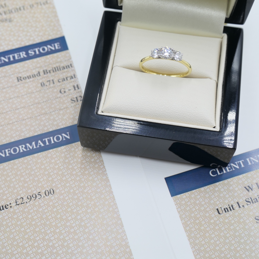 A brand new, unused eternity ring, this piece is crafted in 18ct white and yellow gold, offering a stunning contrast that enhances the brilliance of the diamonds. The ring is set with three brilliant-cut diamonds, totalling 0.71ct. Each diamond boasts a clarity grade of SI2 and a colour range of G-H, making them visually captivating and impressive.
