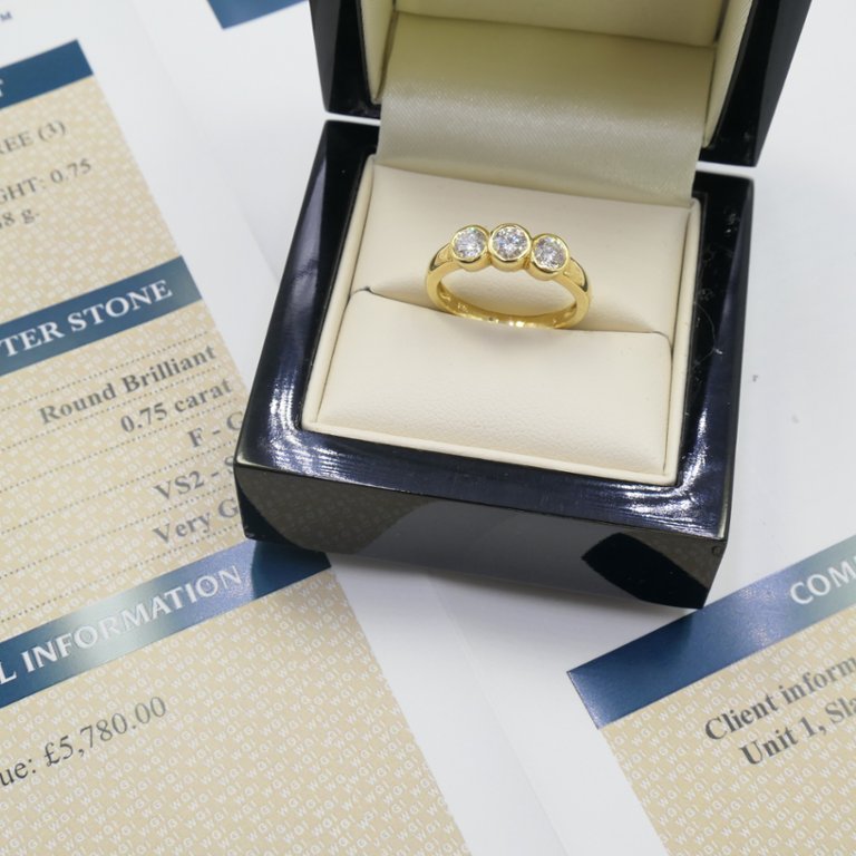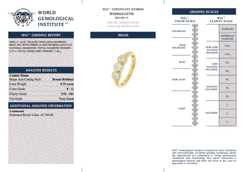 At the centre of this exquisite piece lie three brilliant-cut diamonds totalling 0.75 carats. Each diamond, boasting a clarity grade ranging from VS2 to SI1 and a radiant F-G colour, is meticulously set to create a mesmerising display of brilliance. Beyond their captivating sparkle, these diamonds possess intrinsic value and rarity, making them a wise investment for the future.