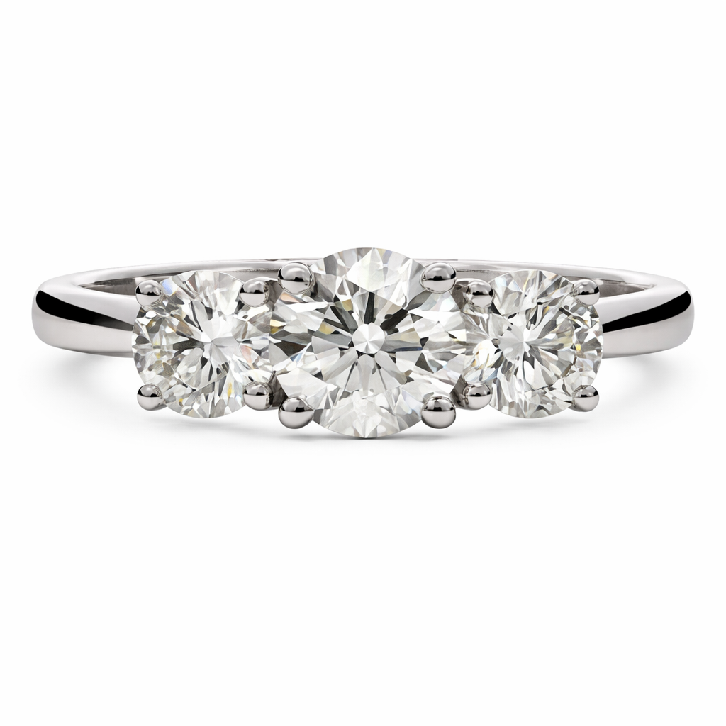 A brand-new, unused certified natural diamond three-stone eternity ring, set with three beautifully matched brilliant-cut diamonds totalling 1.54ct, elegantly mounted in platinum. The classic three-stone design symbolises past, present and future, offering both meaningful sentiment and timeless appeal, while allowing each diamond to stand out with exceptional presence and balance across the setting.