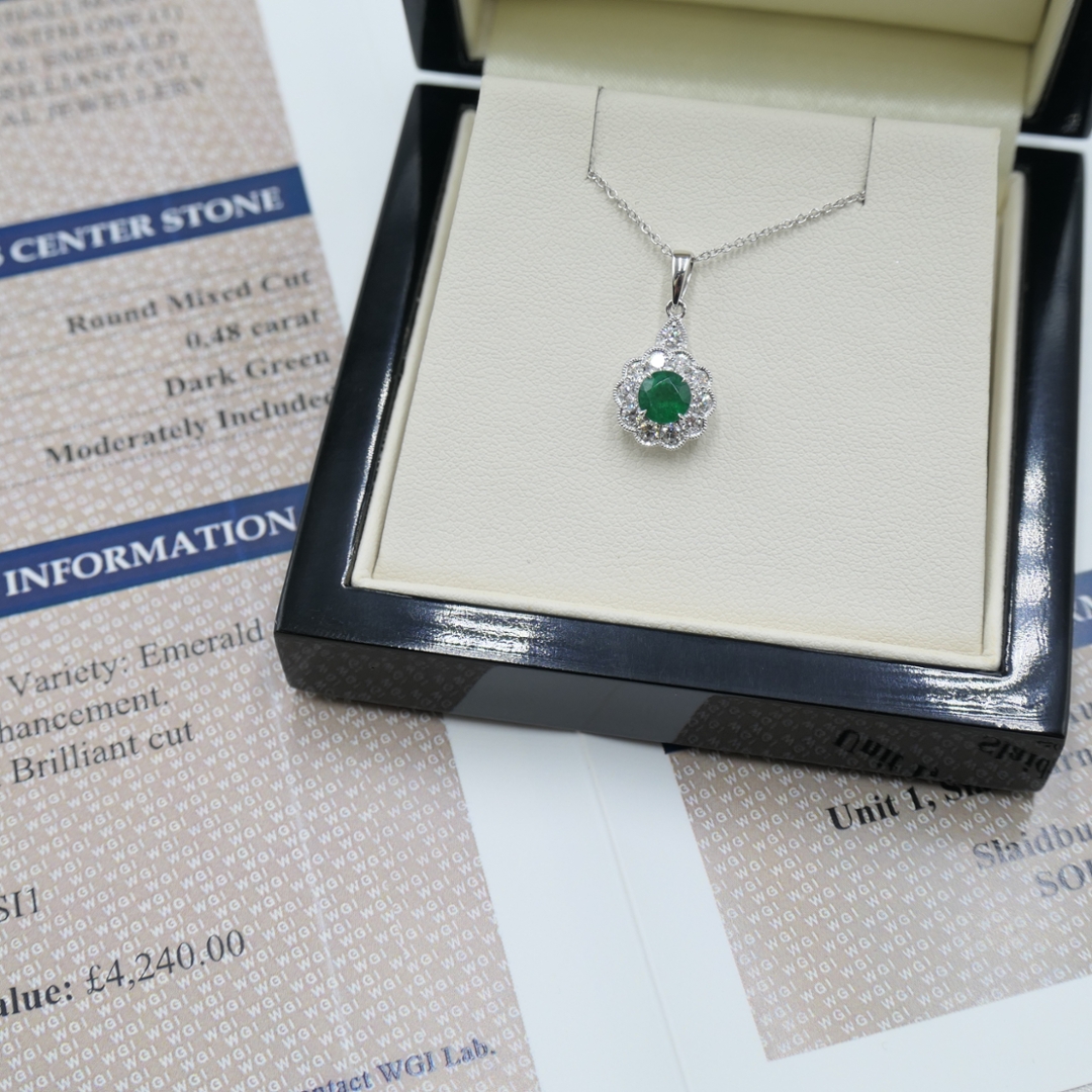 A brand-new, unused certified 18ct white gold natural diamond and emerald flower-shaped cluster pendant, exquisitely crafted to celebrate nature's vibrant beauty. This stunning piece features a central round mixed-cut emerald weighing 0.48ct, showcasing a deep, rich, dark green colour that exudes elegance and rarity. Surrounding the emerald is a radiant halo of brilliant-cut natural diamonds, totalling 0.37ct, each with VS2-SI1 clarity and G-H colour. The white gold setting provides a perfect, luminous backdrop, allowing emerald and diamonds to shine with striking intensity and grace. Weighing 2.70 grams.