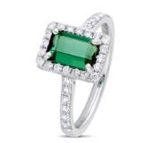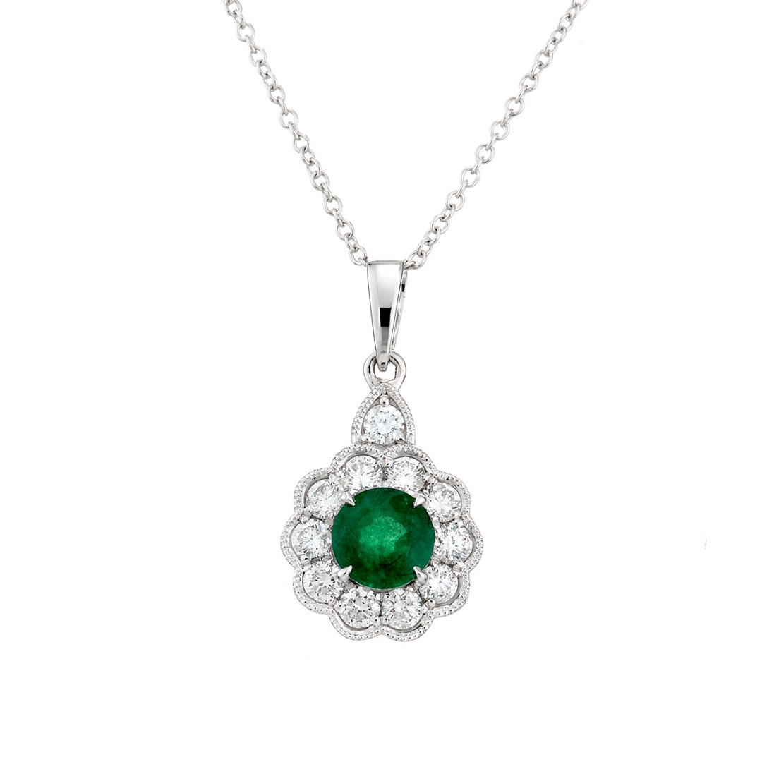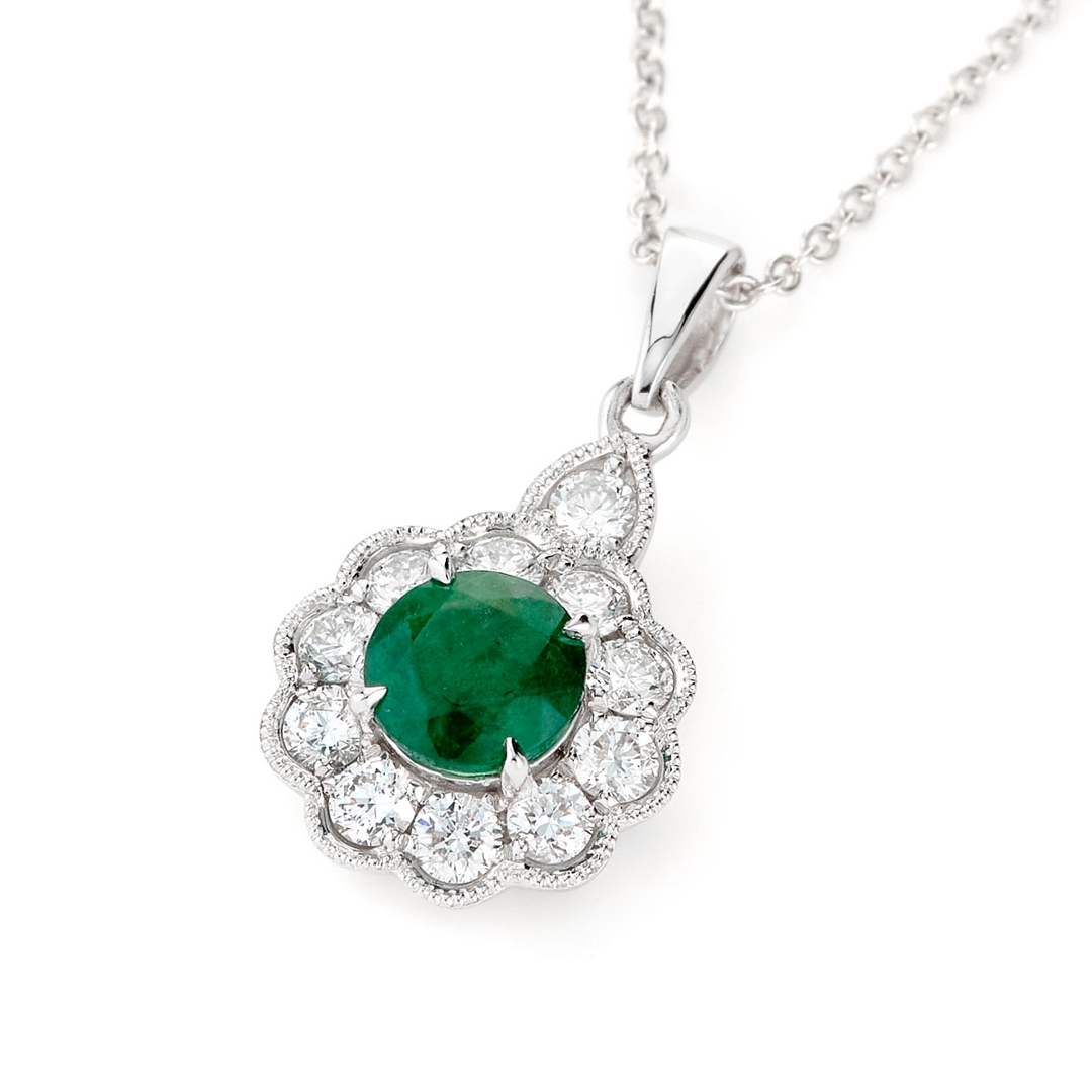 A brand-new, unused, certified natural diamond & emerald gemstone, flower-shaped cluster pendant, set with one round mixed-cut emerald gemstone & a cluster of brilliant-cut diamonds in a halo setting, set in 18ct white gold.