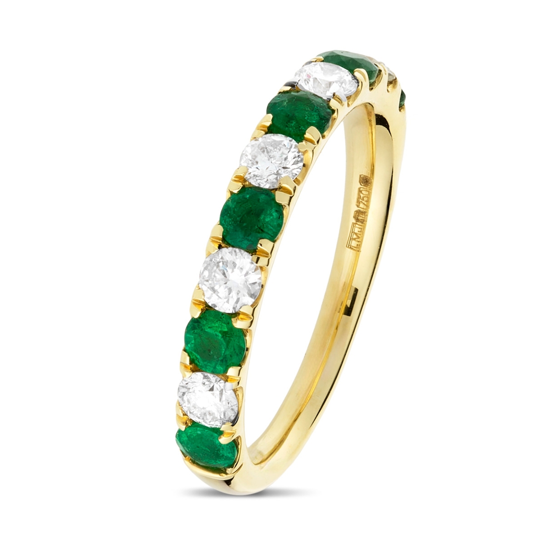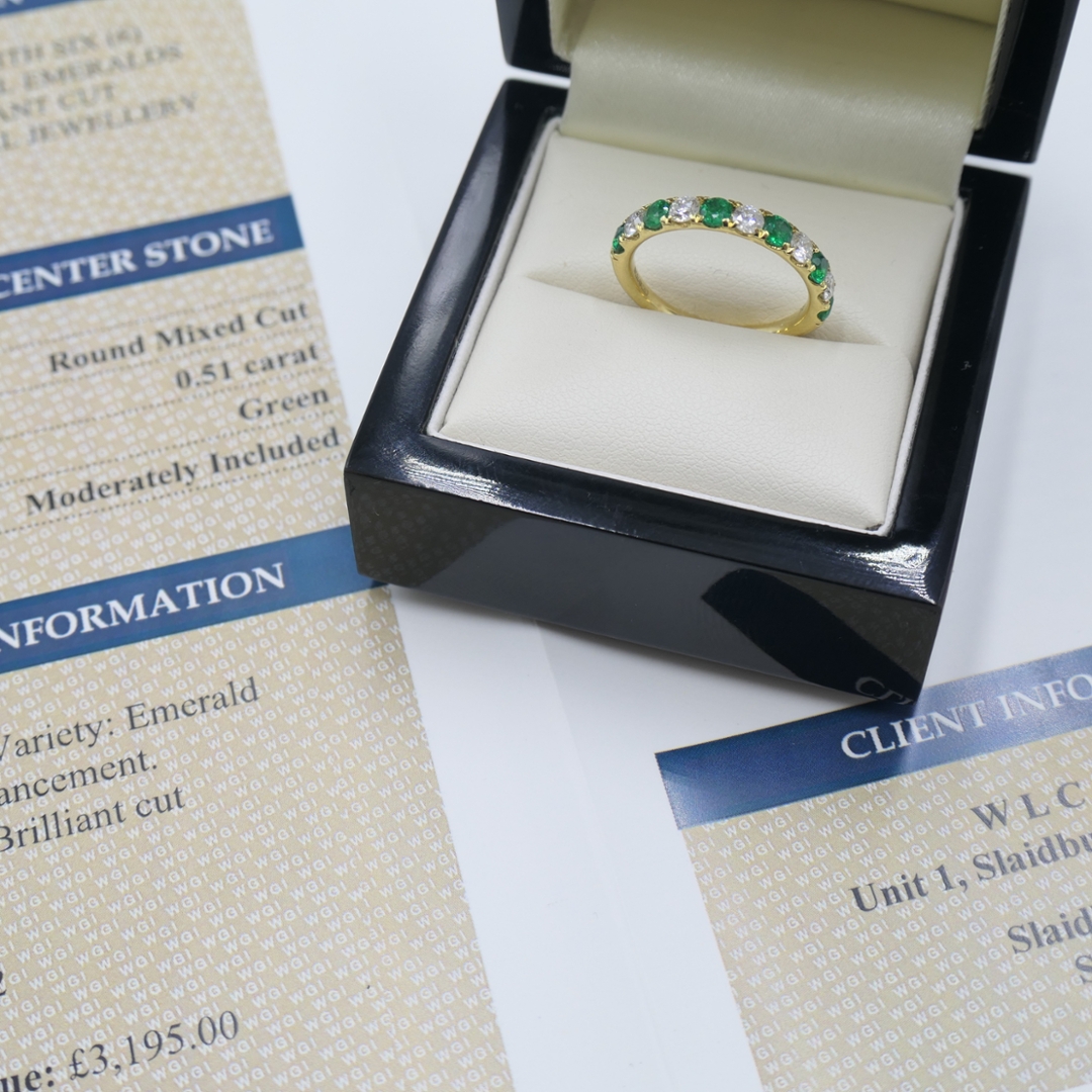 A brand-new, unused certified 18ct yellow gold eternity ring, this piece is set with six round mixed-cut emerald gemstones, totalling 0.51ct. The emeralds, with their rich green hue, create a stunning focal point, offering a vibrant burst of colour. Surrounding these emeralds are five brilliant-cut diamonds, totalling 0.49ct, which provide an exceptional sparkle that enhances the emeralds’ natural beauty.