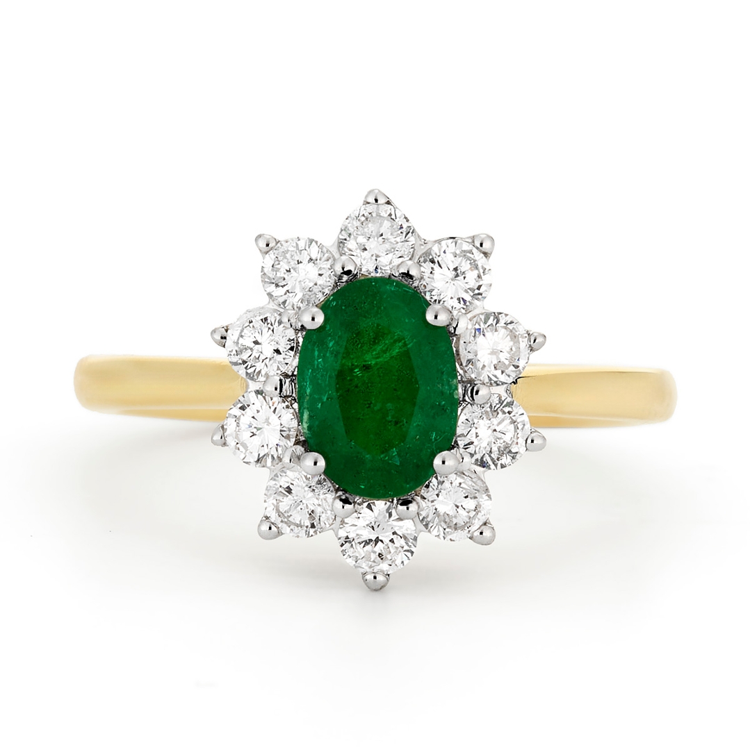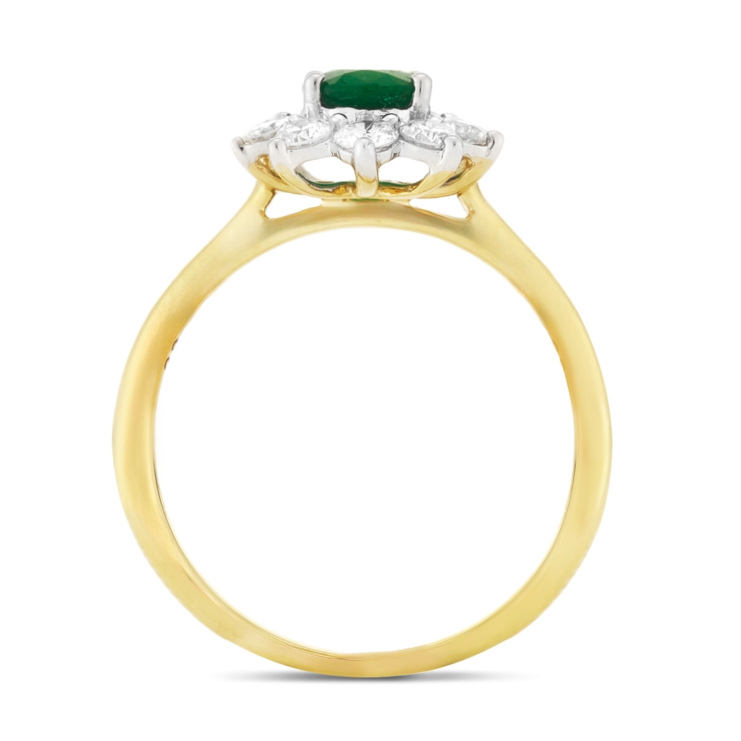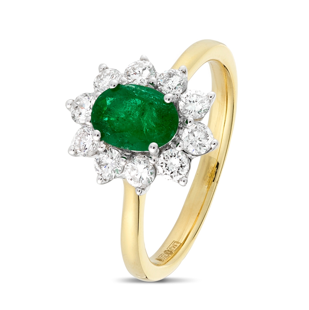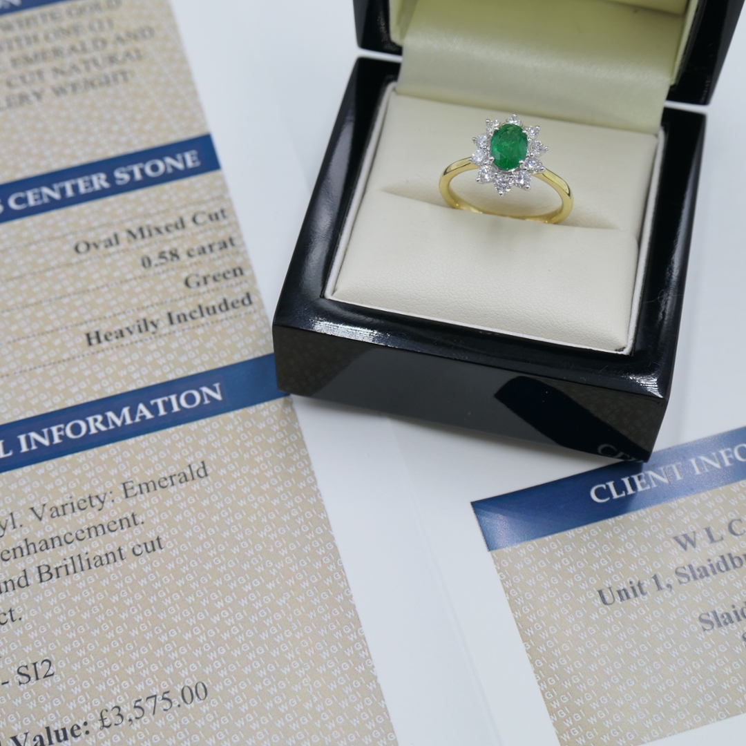 A brand-new, unused certified 18ct yellow and white gold cluster ring, this piece showcases a stunning oval mixed-cut emerald gemstone at its centre, weighing 0.58ct. The emerald's deep green colour adds a sense of elegance and rarity, making it a captivating centrepiece. Surrounding the emerald is a halo of brilliant-cut diamonds, totalling 0.56ct, which enhances the gemstone's beauty with its radiant sparkle.