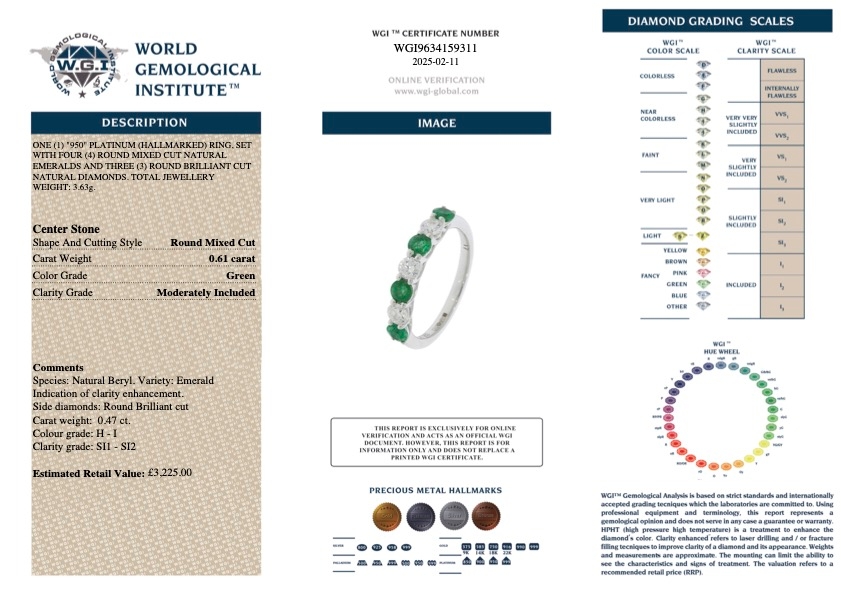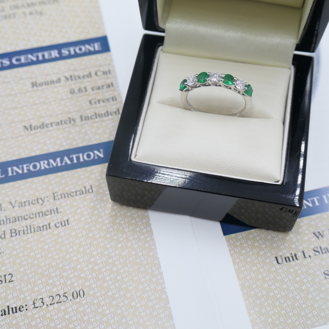 A brand new, unused, certified natural diamond & emerald gemstone eternity ring, set with four round mixed cut emerald gemstones & three brilliant cut diamonds, set in platinum.