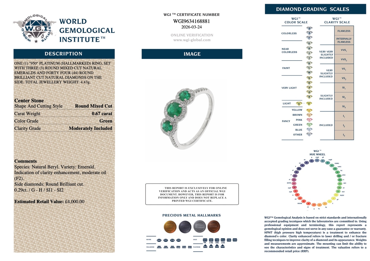 With a total weight of 4.43 grams, the ring offers a substantial yet comfortable feel, reflecting its quality craftsmanship. Valued at £4,000, this piece represents a compelling opportunity to acquire a refined, eye-catching ring with solid investment potential.
