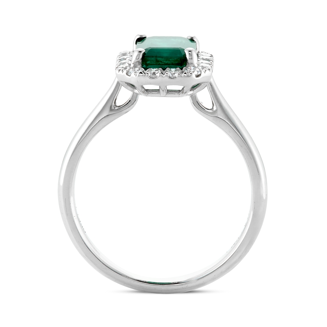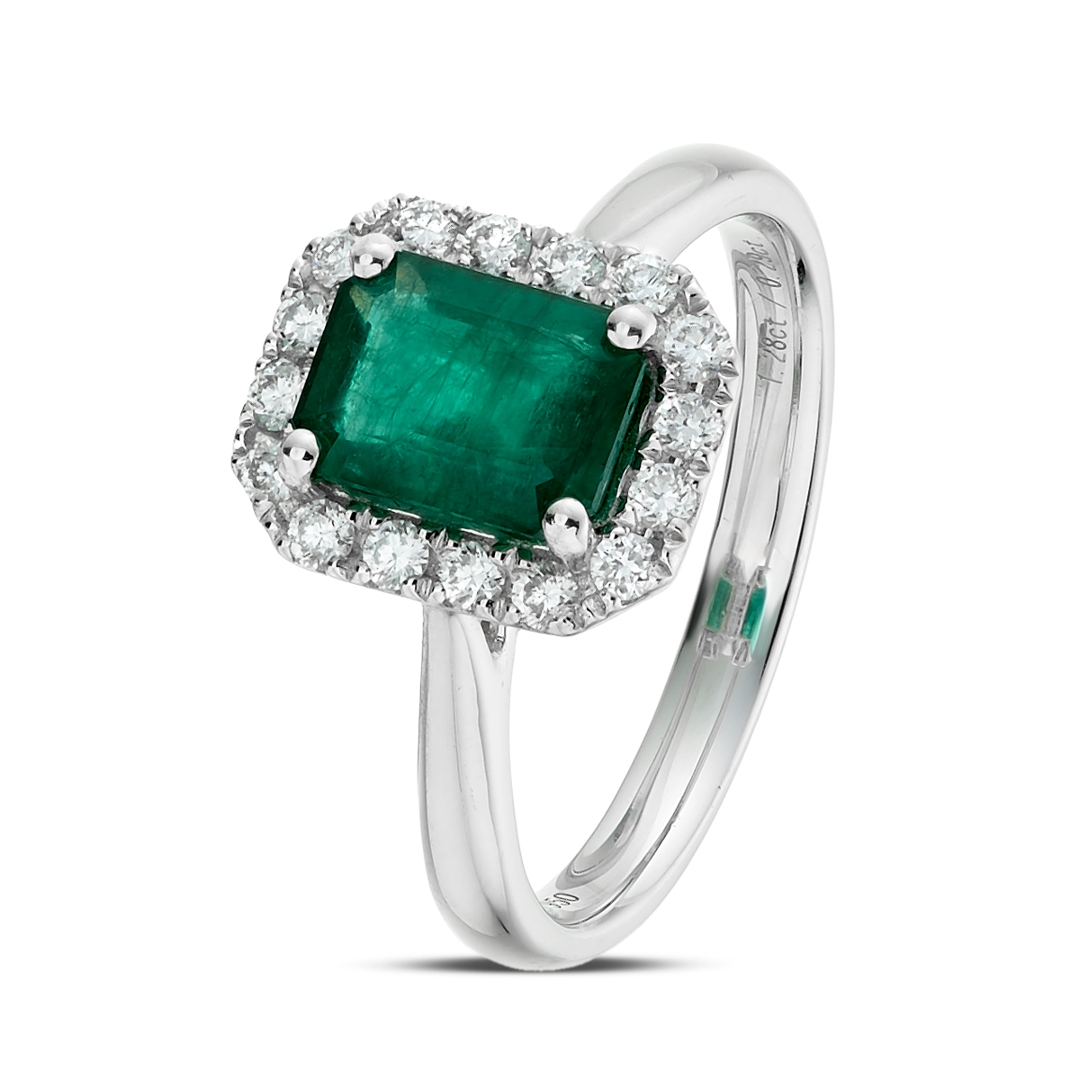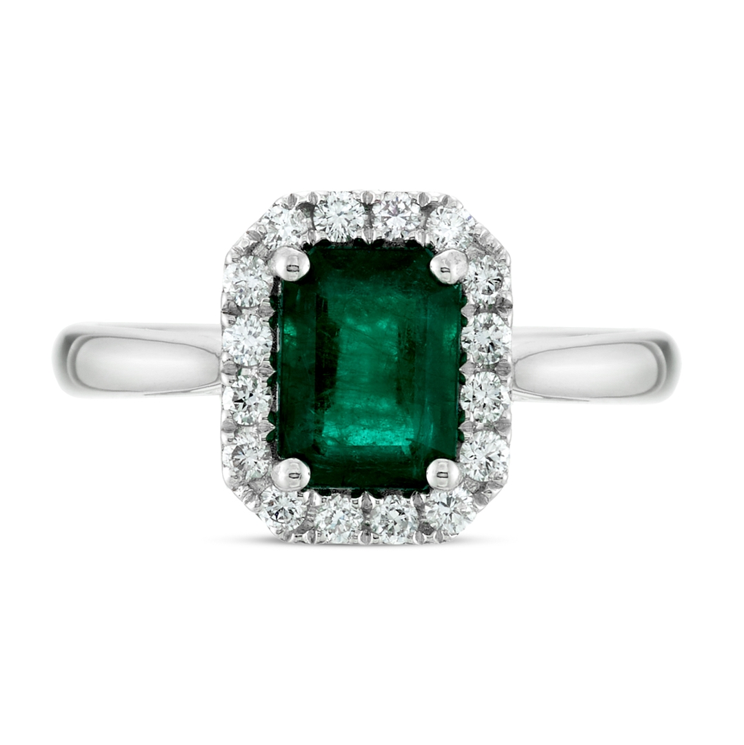 - > Natural Emerald 1.28ct & Diamond 0.29ct Emerald Shaped Cluster Ring
